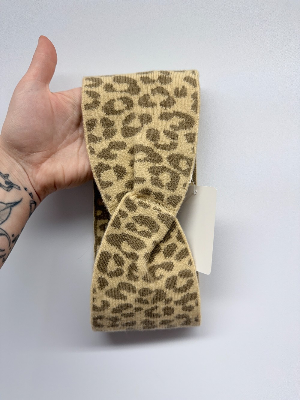 Details: Beige and taupe leopard print knit headband with twist. Reversible!
