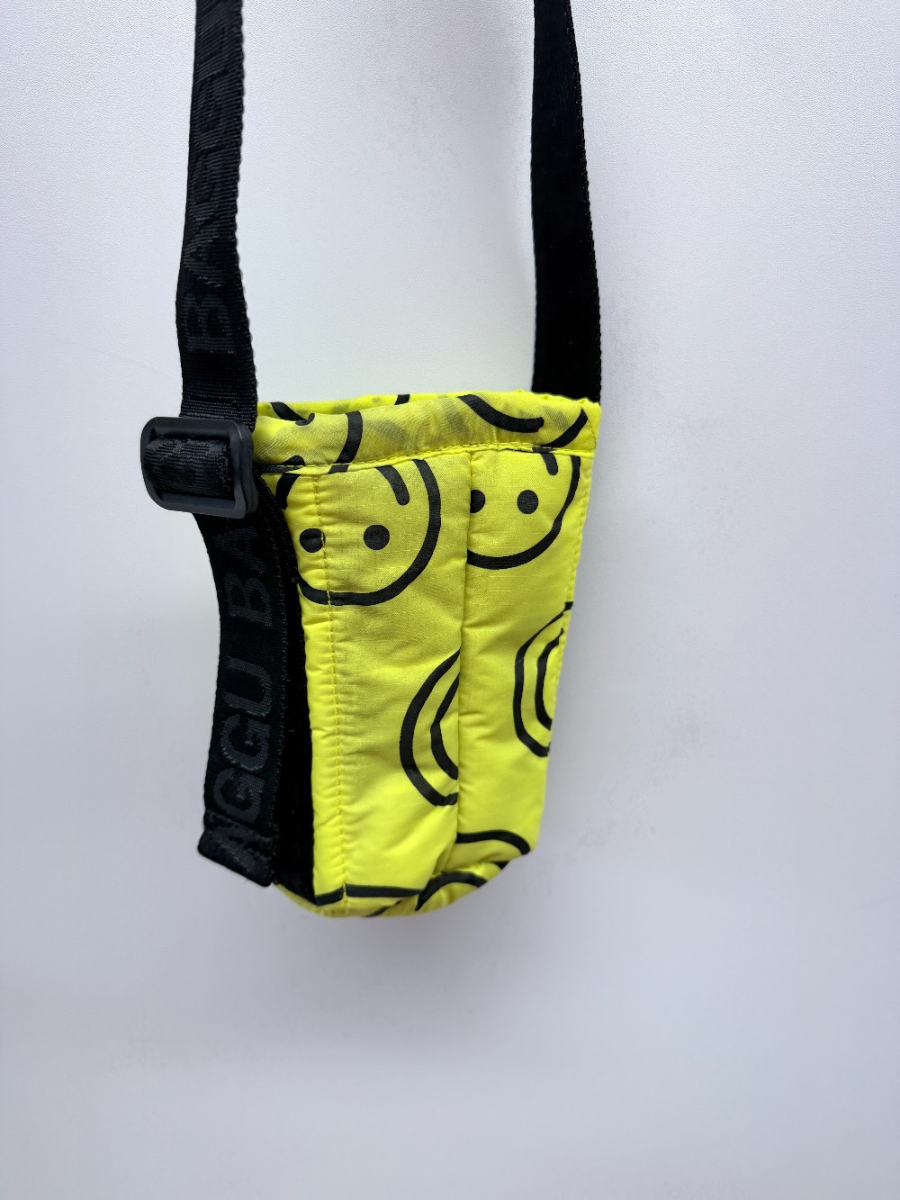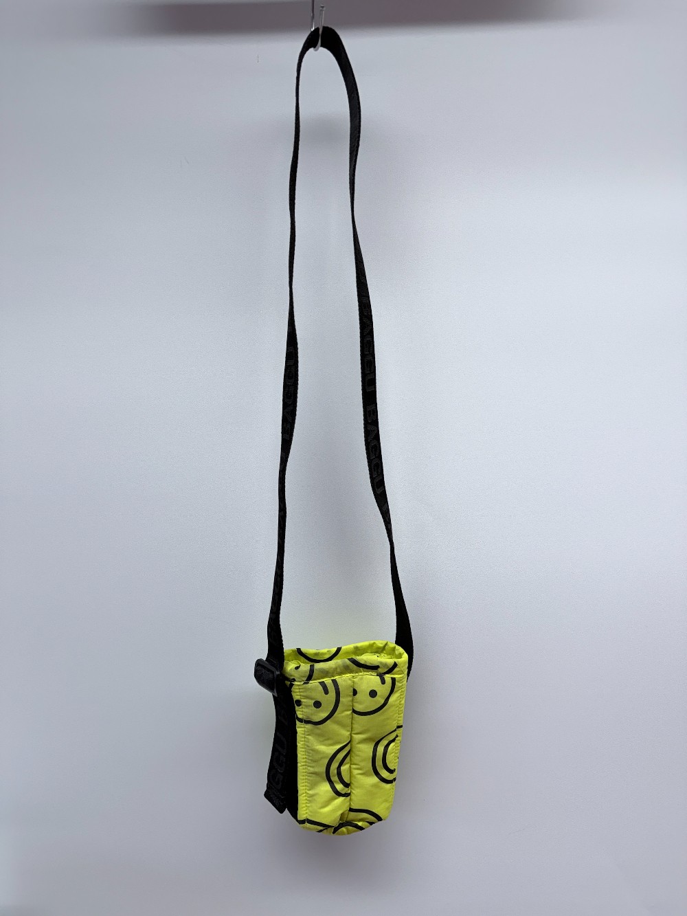 Details: Bright yellow smiley face crossbody mini bag with adjustable strap.