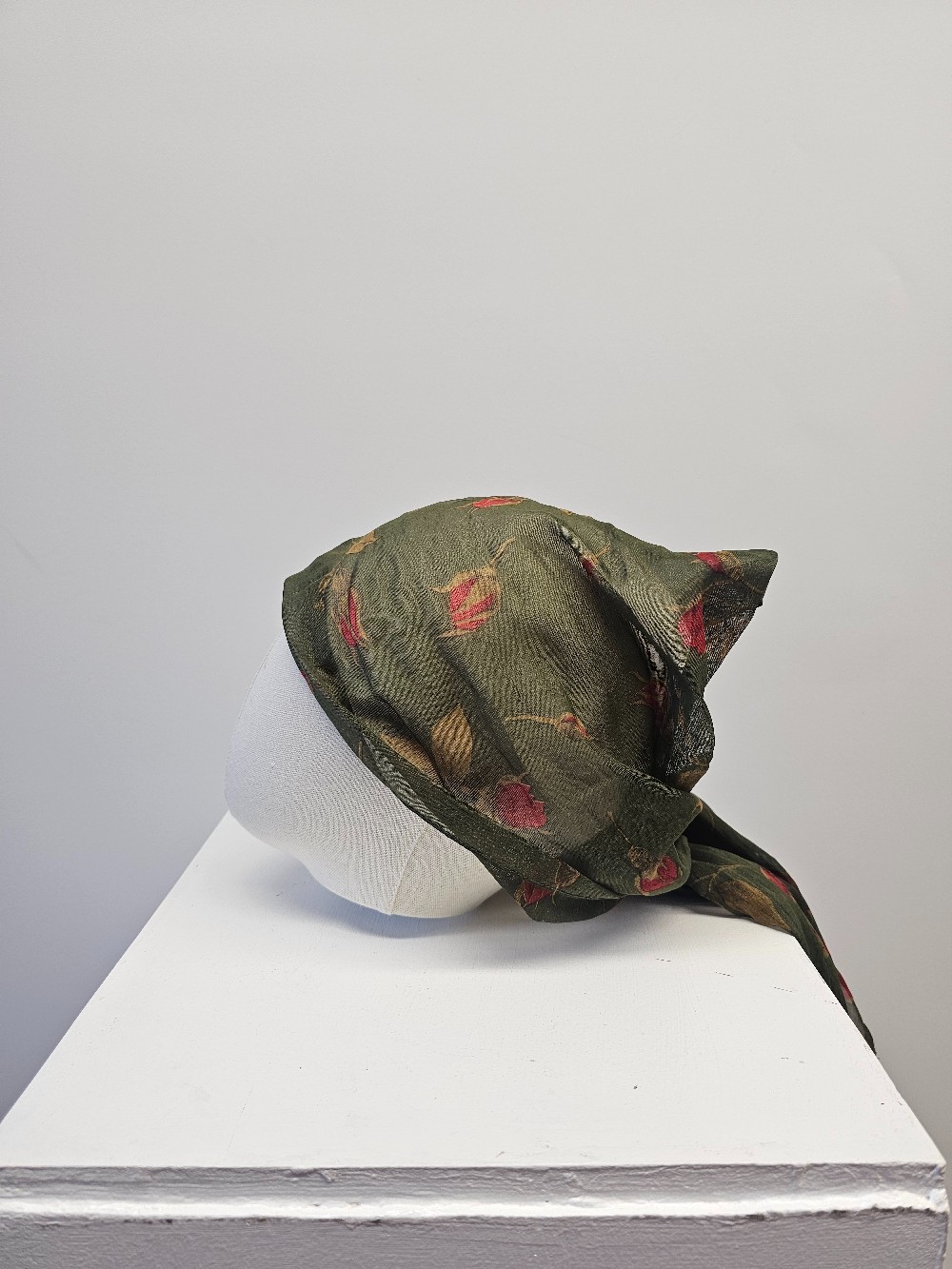 Details: Forest green and red rose print scarf