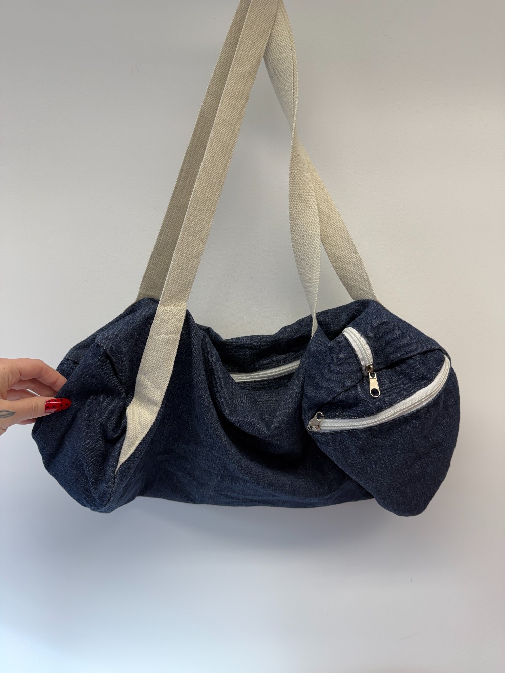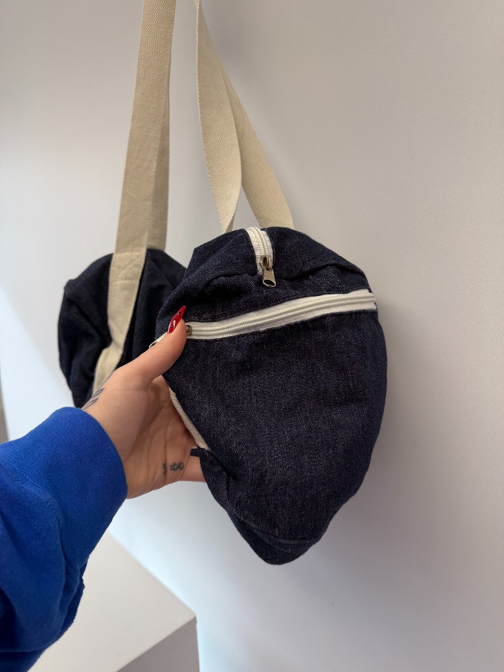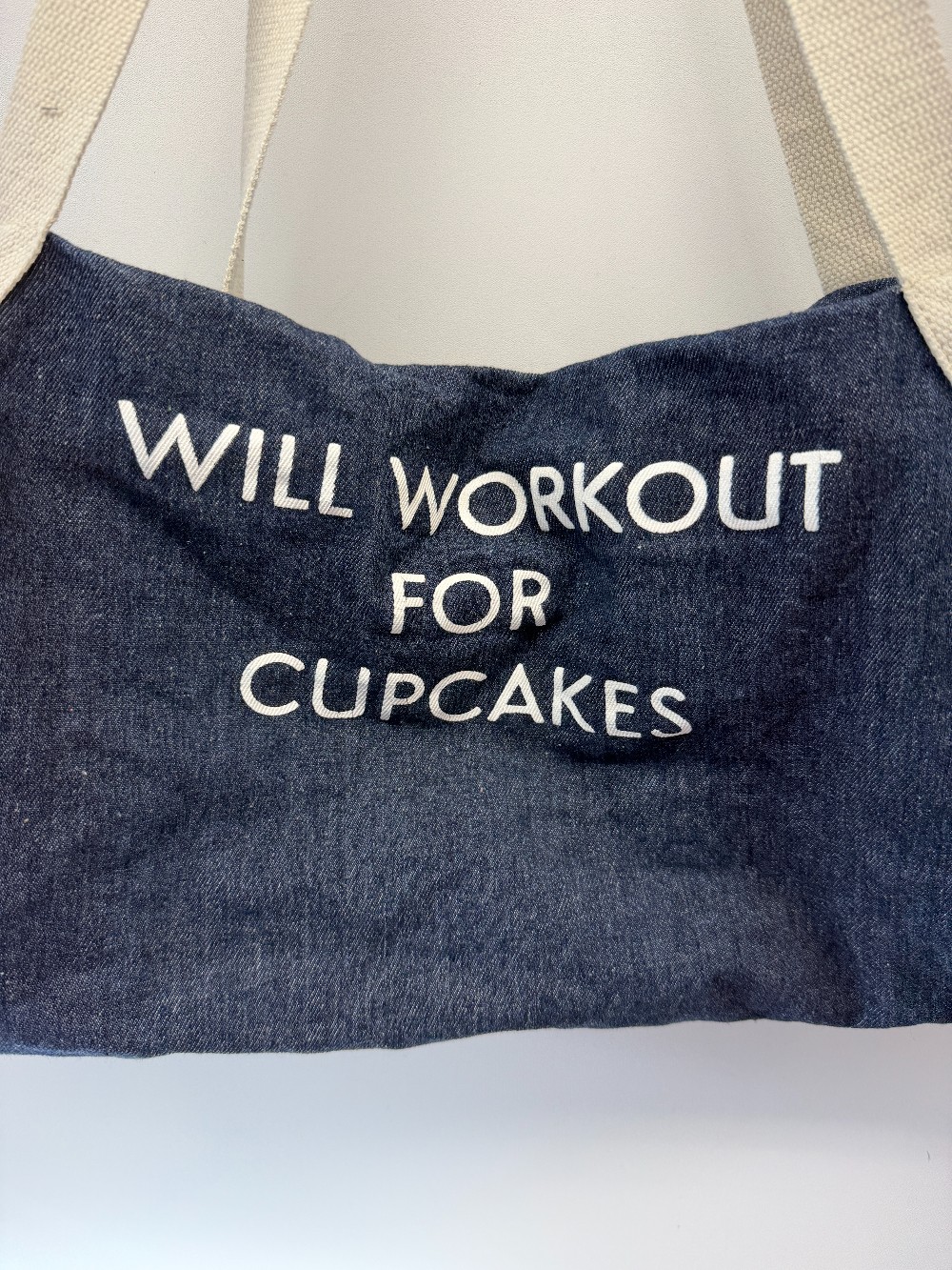 Details: Dark wash denim and white "Will Workout For Cupcakes" mini duffel bag.