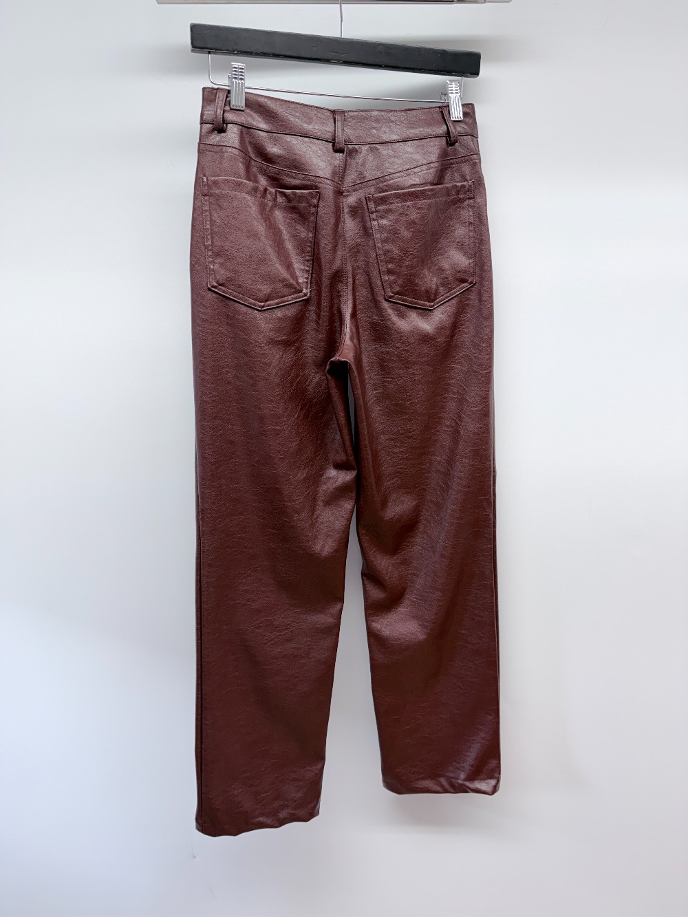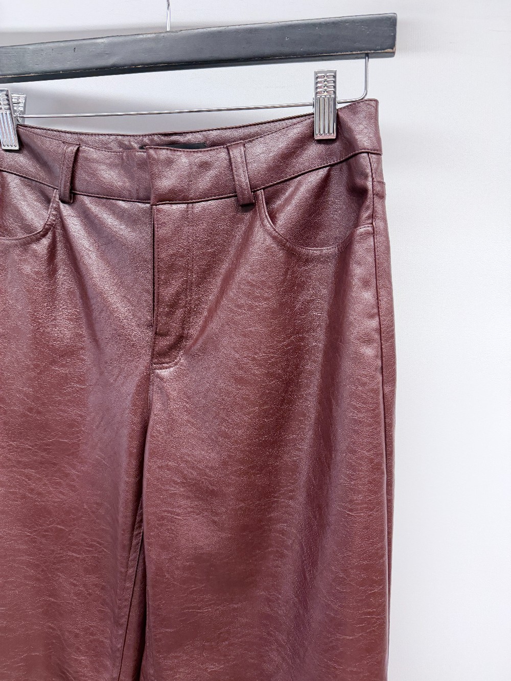 Details: Cherry red pleather pants.