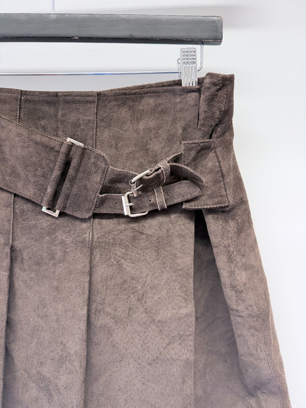 Details: Dark brown suede pleated short wrap skirt with buckle detail.