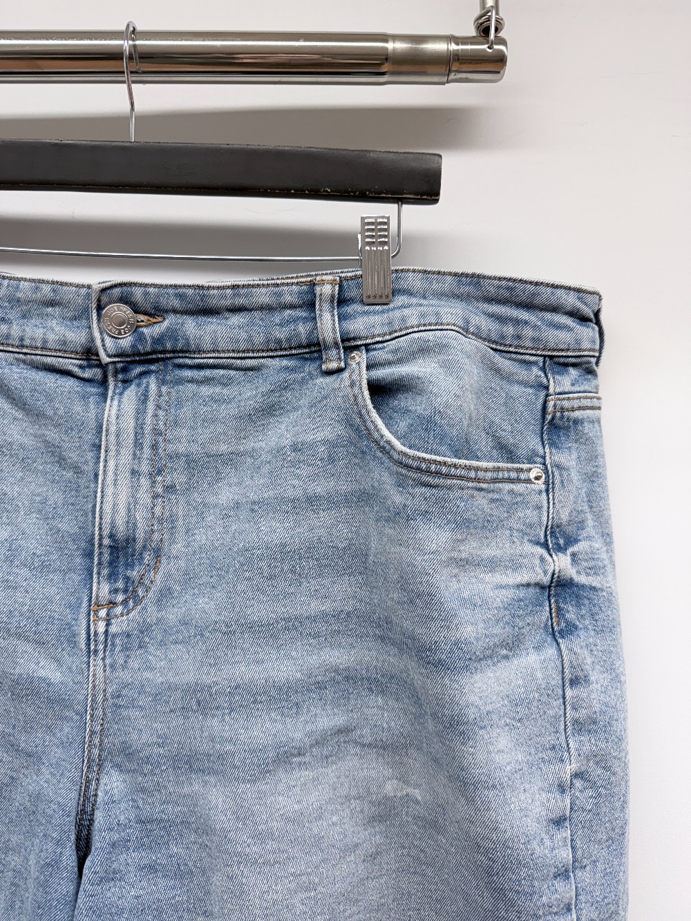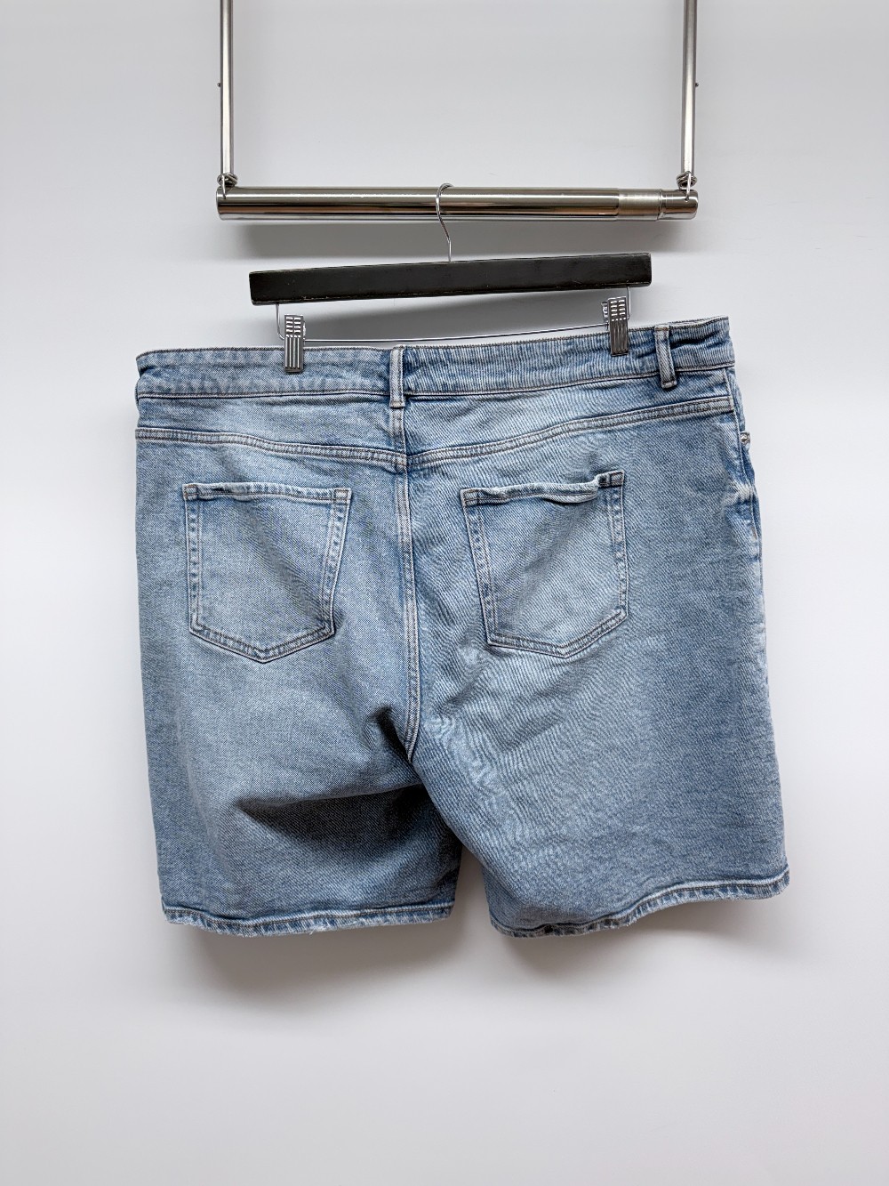 Details: Light wash denim shorts.