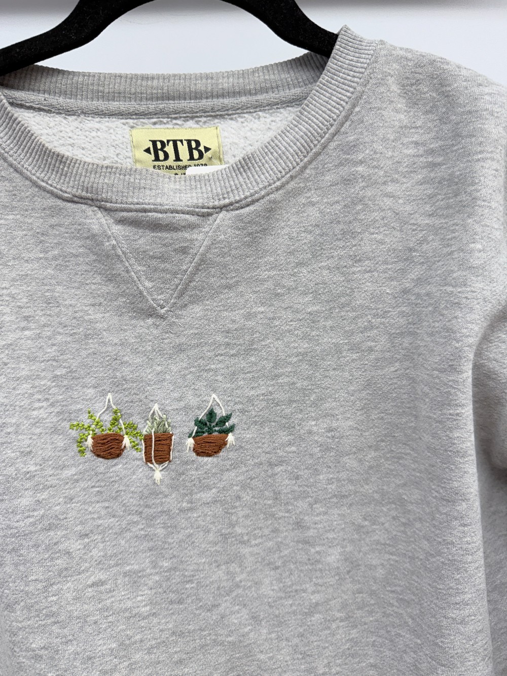 Details: Grey crewneck with embroidered plants.