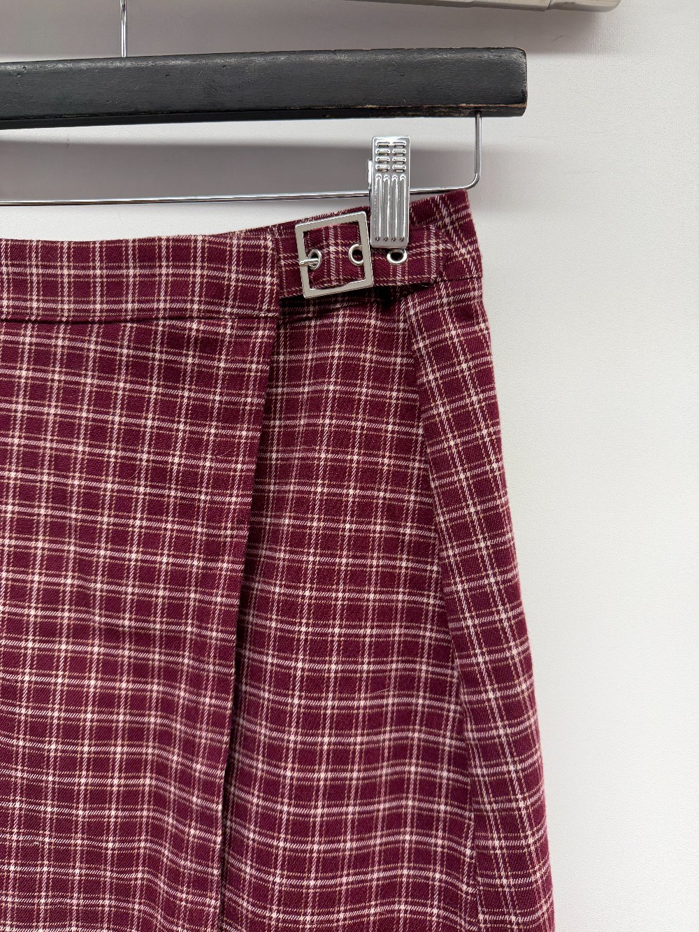 Details: Cherry red and cream plaid wrap short skirt with buckle closure.