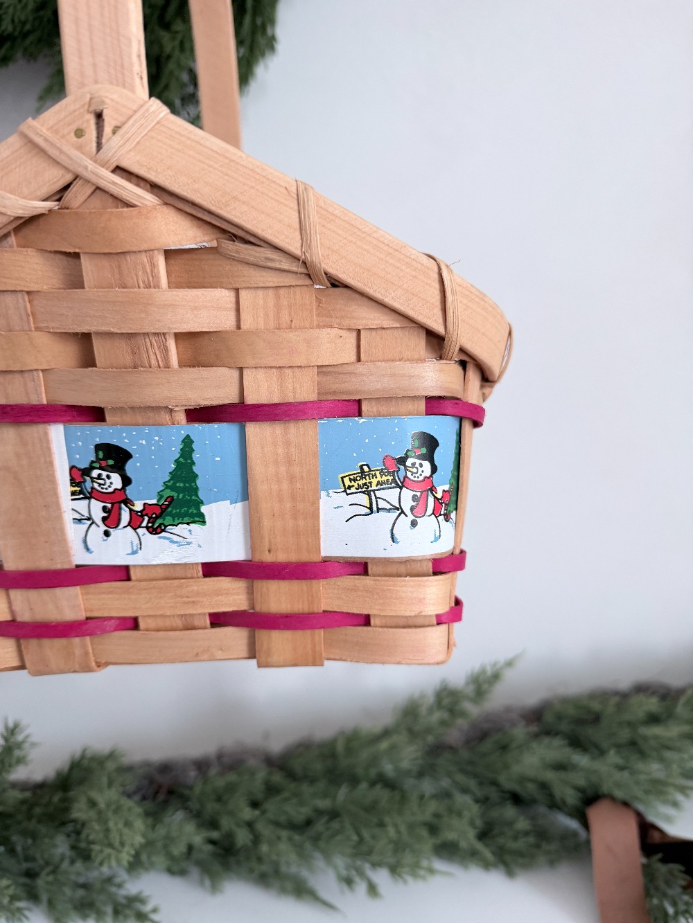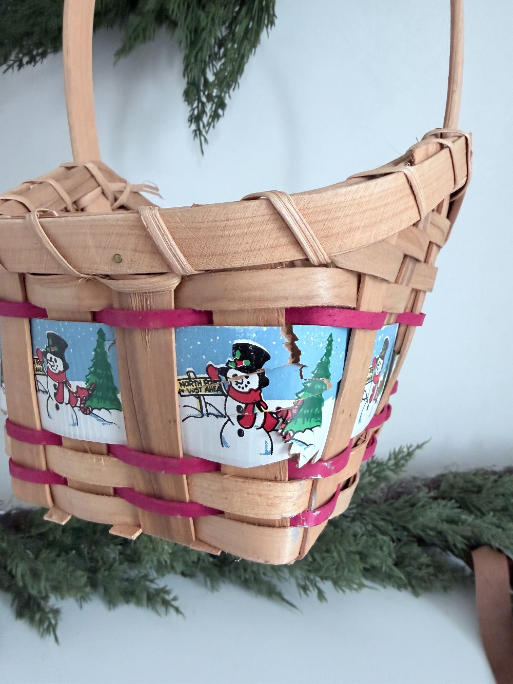 Details: Woven basket with snowman design. Crack on side as shown, priced as is.