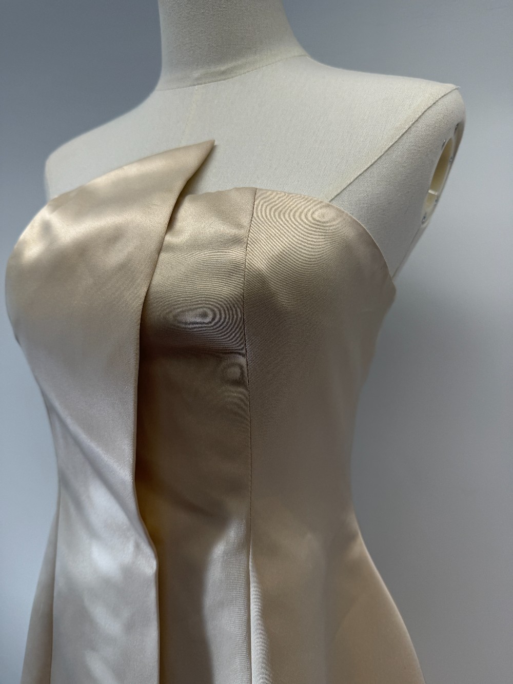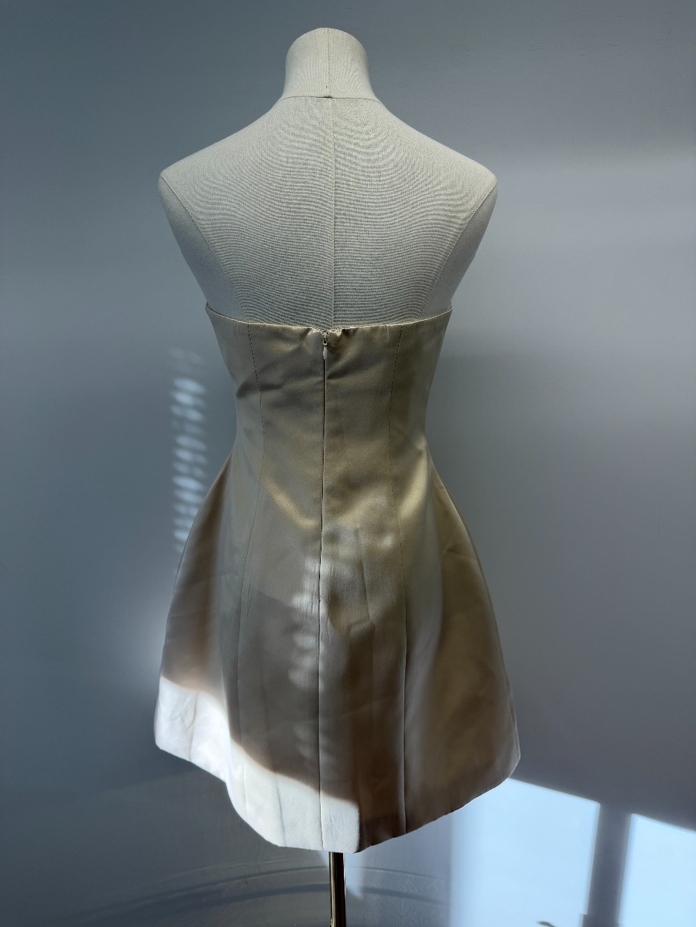 Details: Champagne asymmetric strapless satin mini dress.