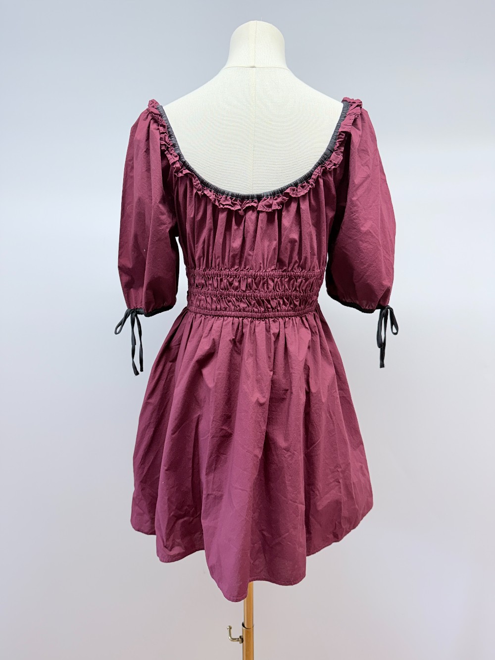 Details: Burgundy short puff sleeve short dress with ruched waist and black trim.