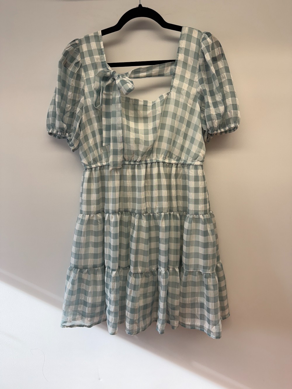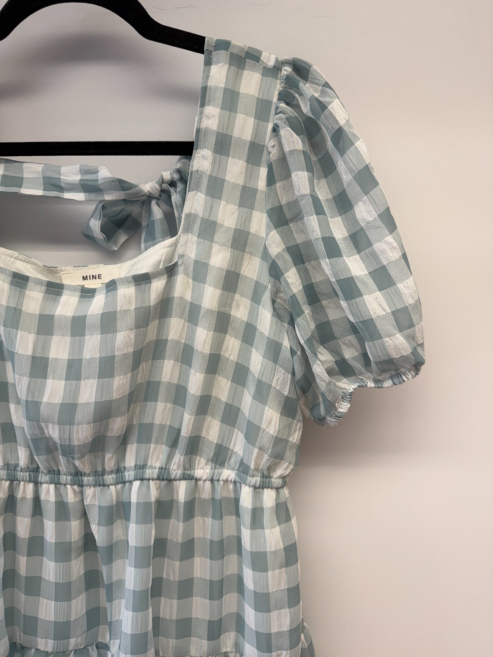 Details: Light blue and white gingham short puff sleeve dress.