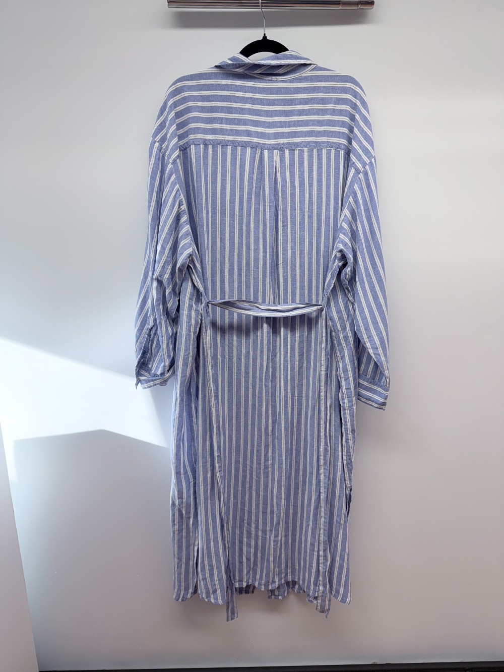 Details: Blue and white striped collared button up linen blend dress with tie. New with tags!