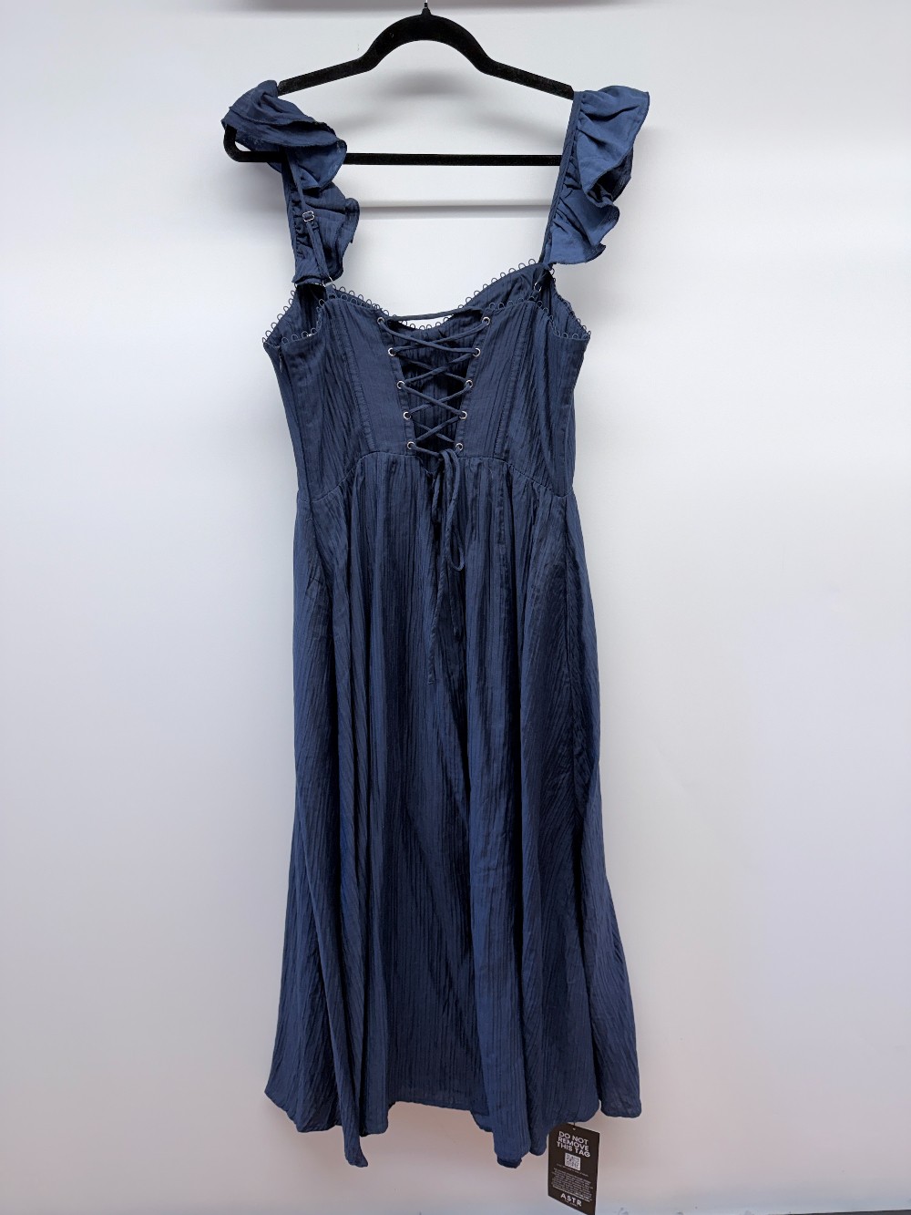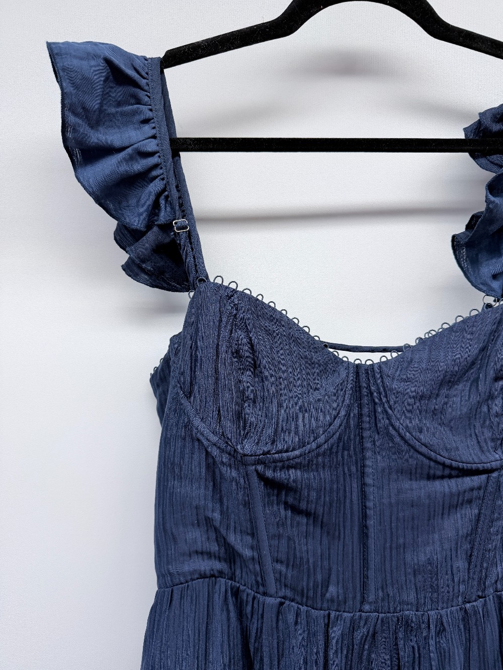 Details: Navy blue ruffle strap textured tie up back dress. New with tags!