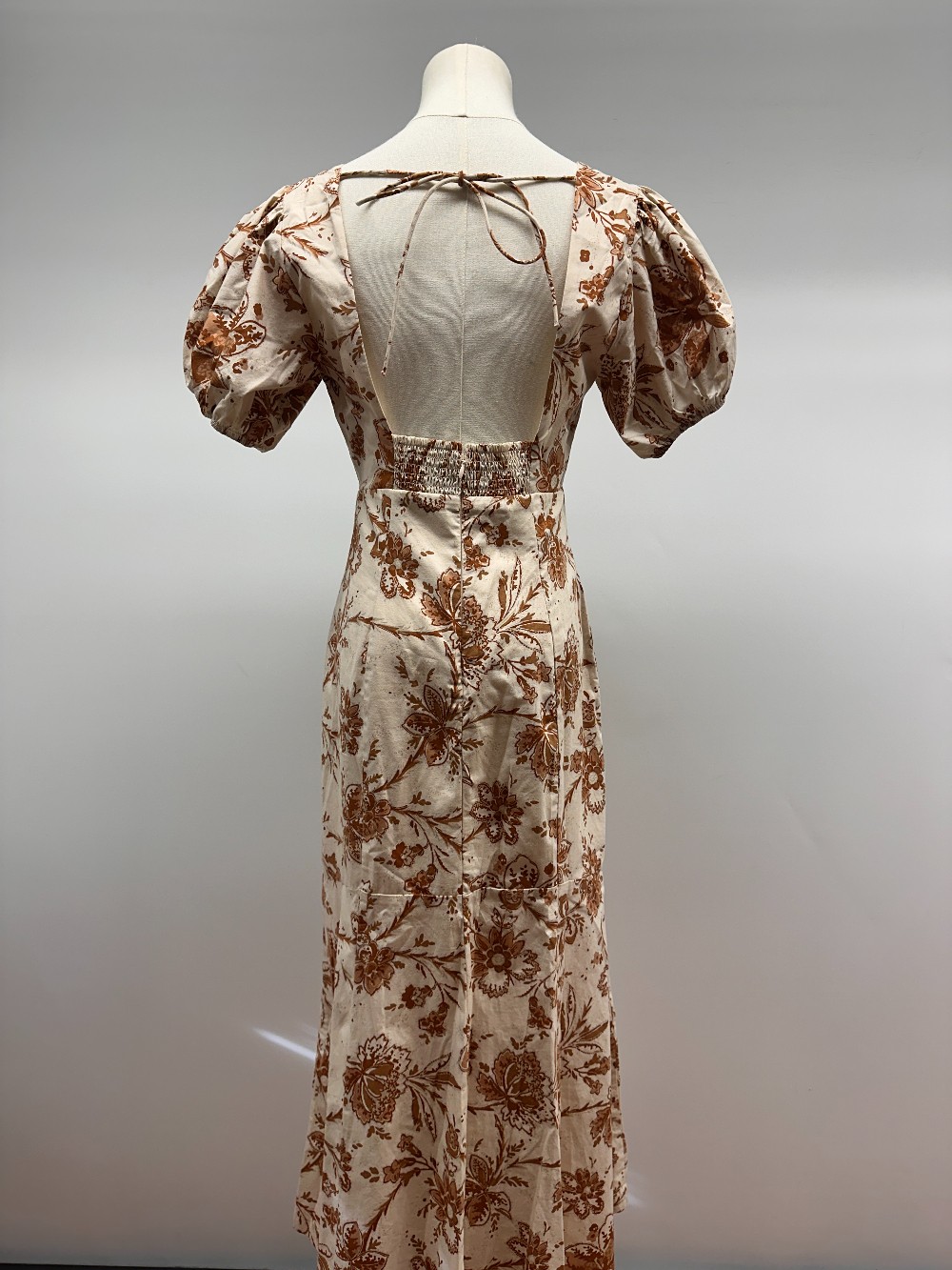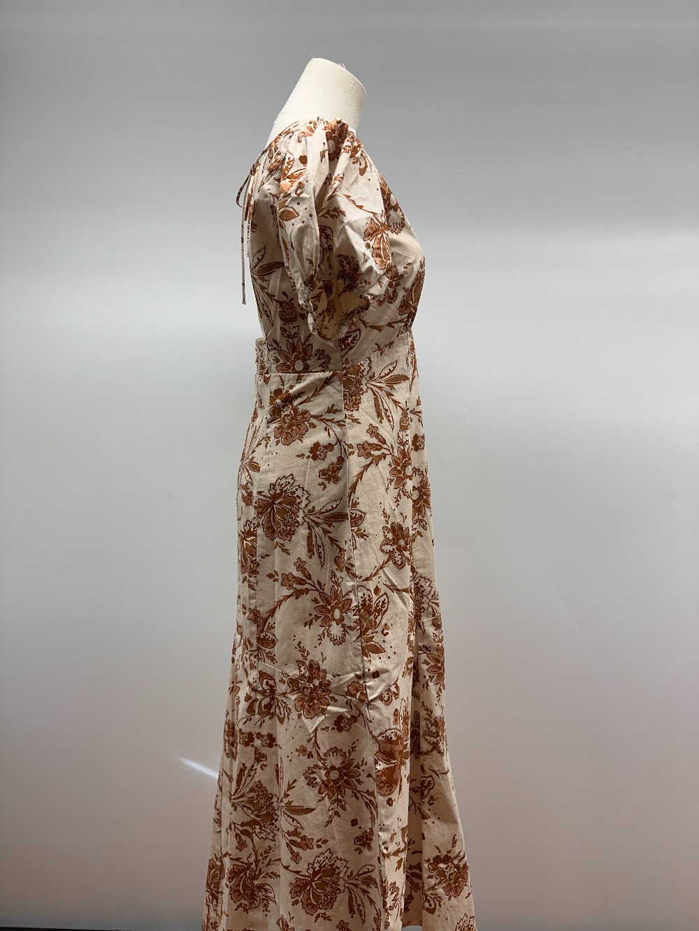 Details: Cream and brown floral print short puff sleeve maxi dress.