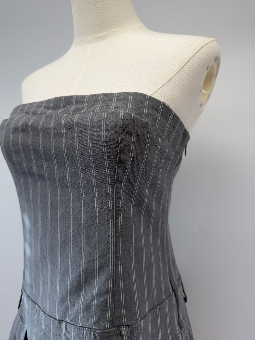 Details: Grey and white pinstriped pleated strapless mini dress.