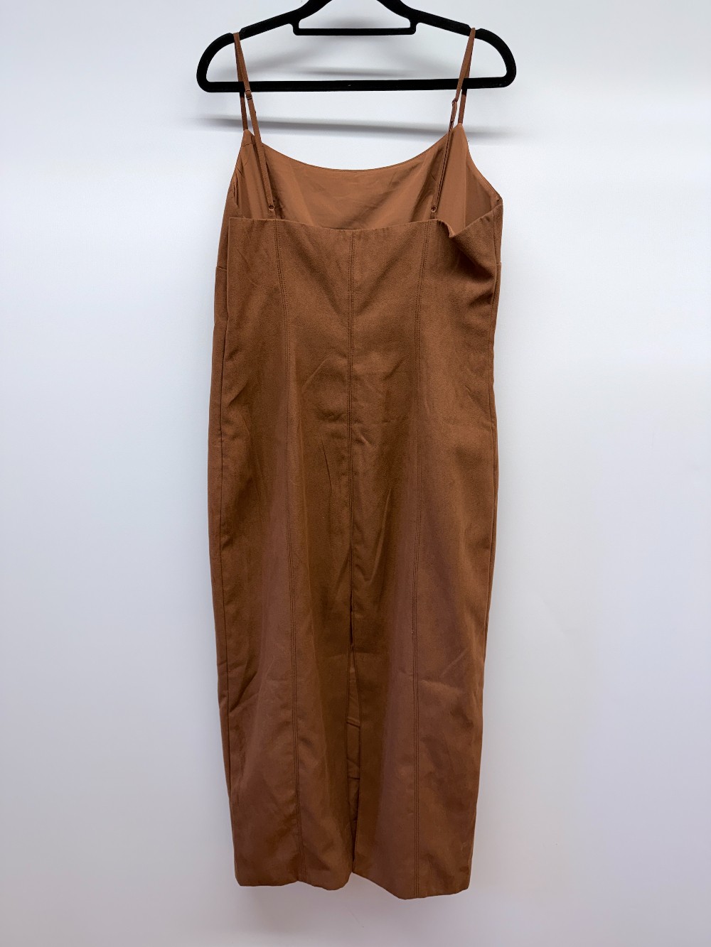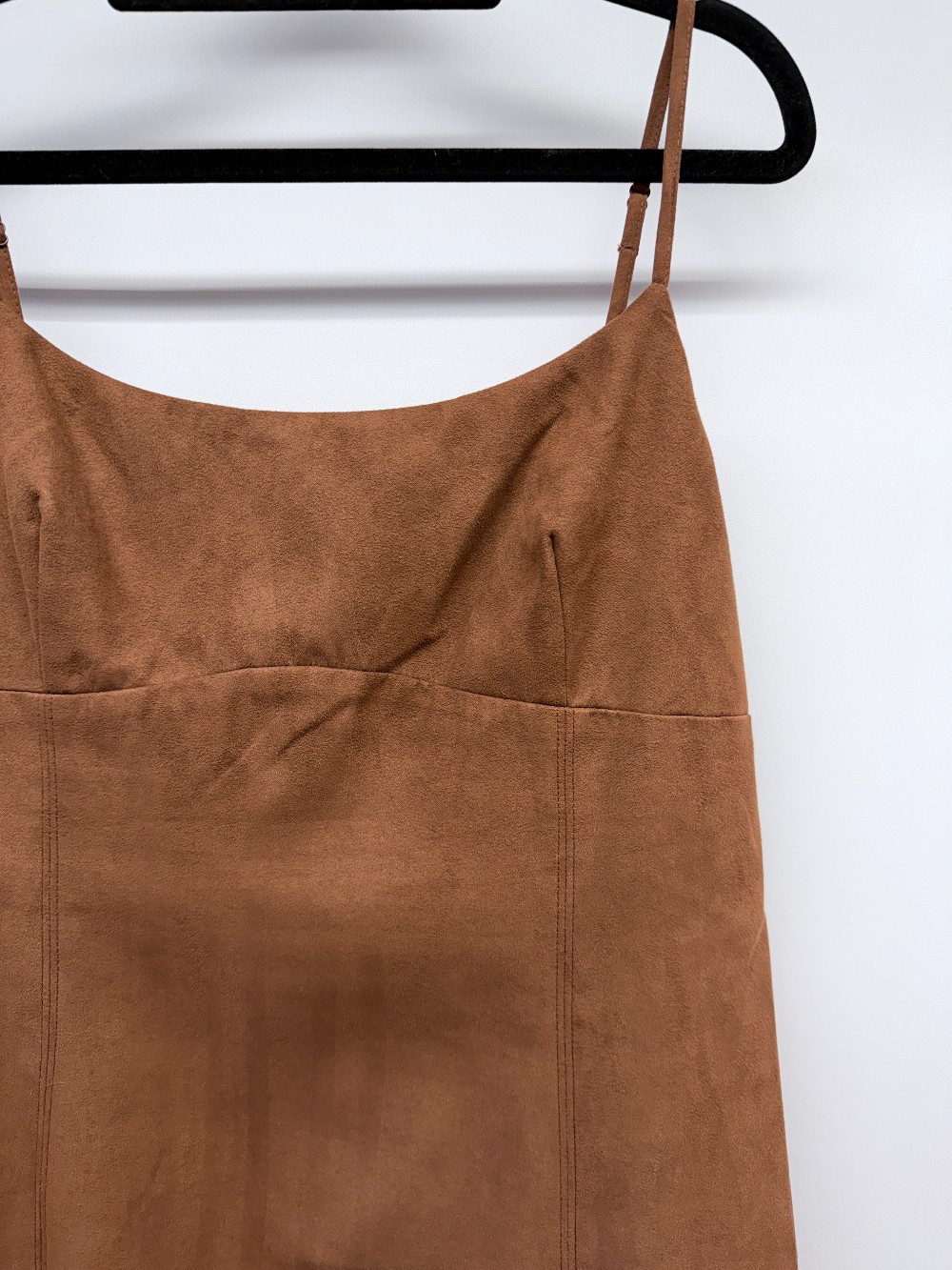 Details: Burnt brown suede spaghetti strap dress with back slit.