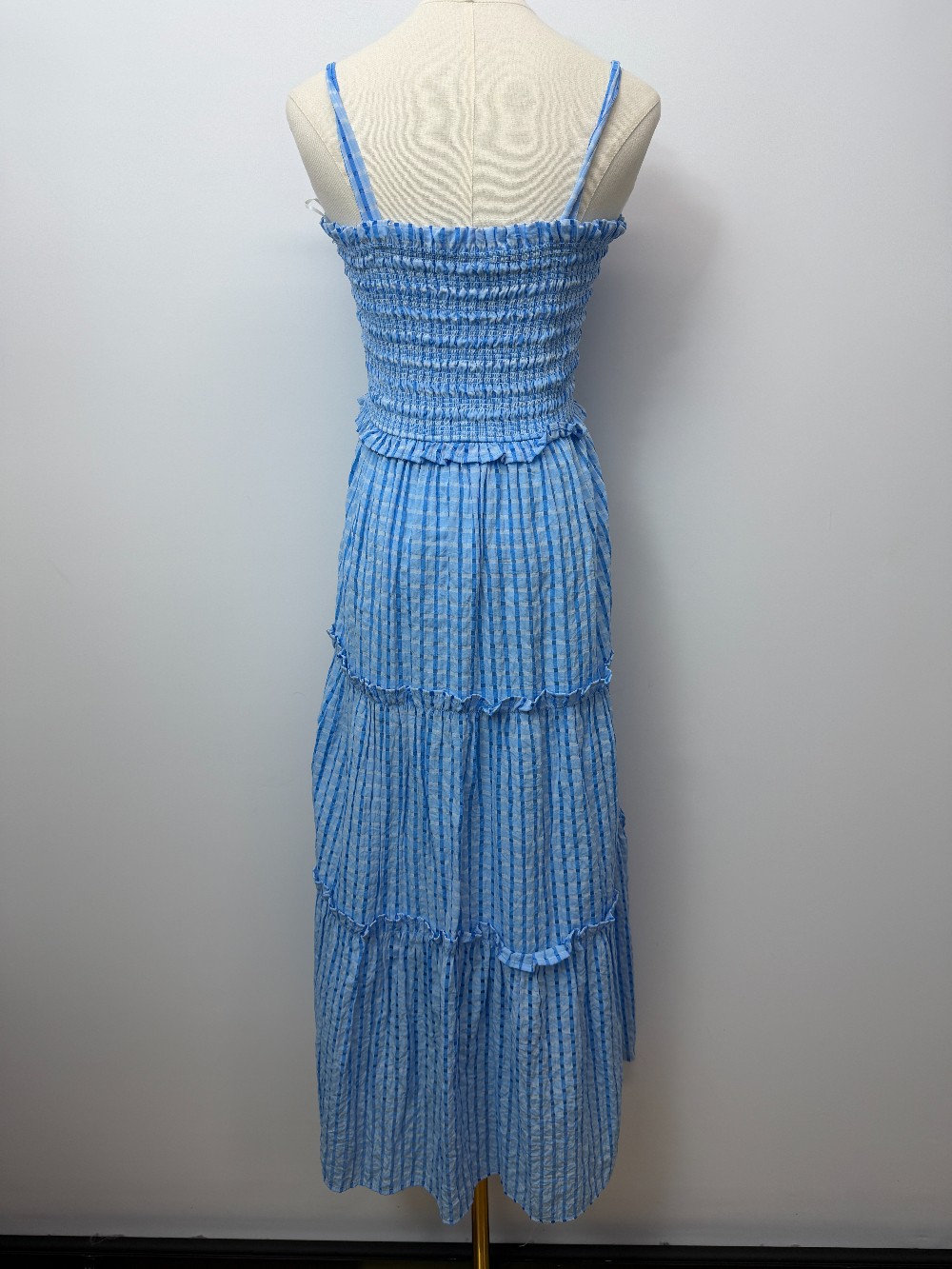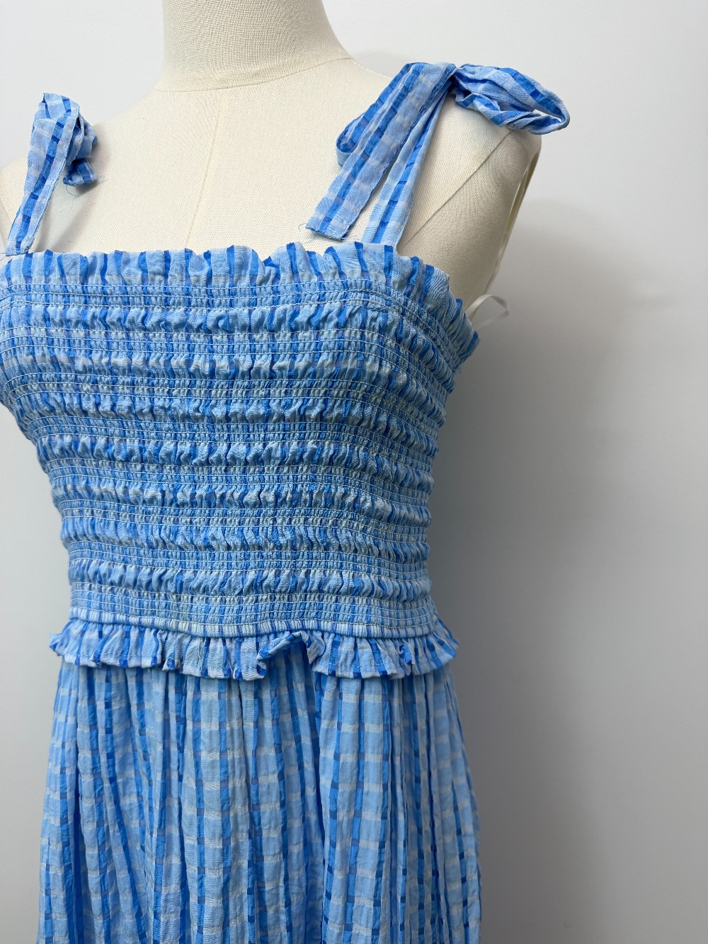 Details: Bright blue gingham print dress with tie straps.
