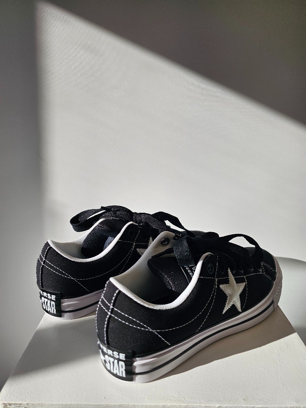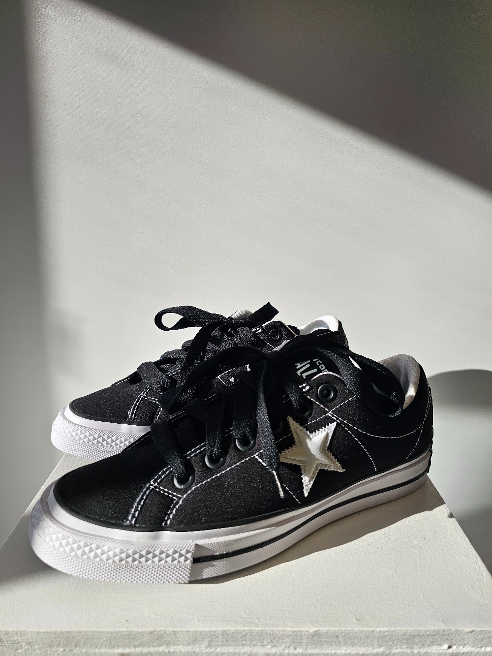 Details: Black and white low top sneakers with star.