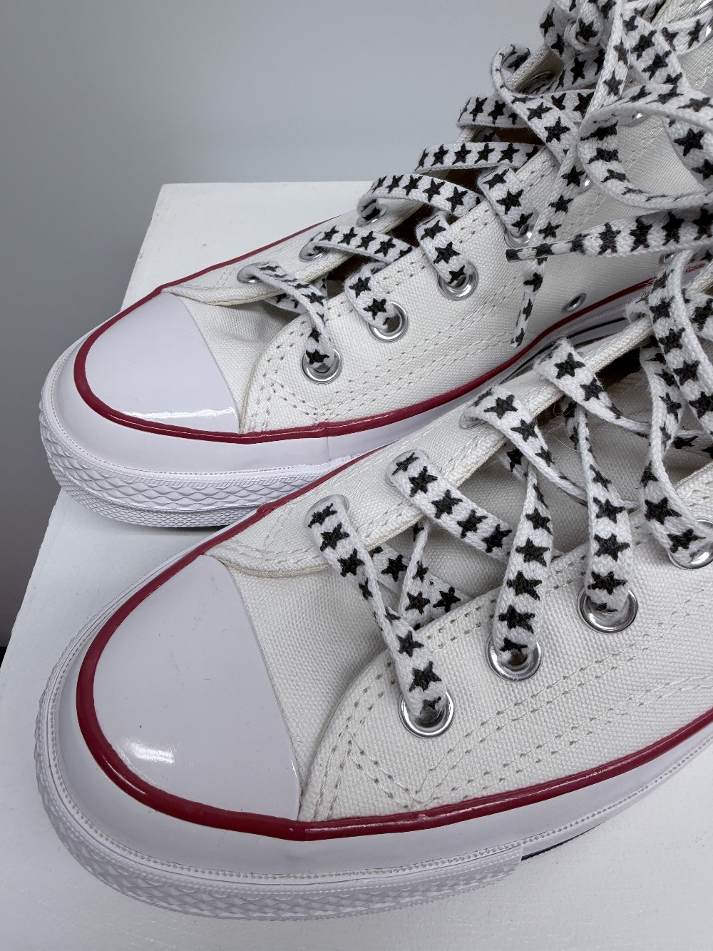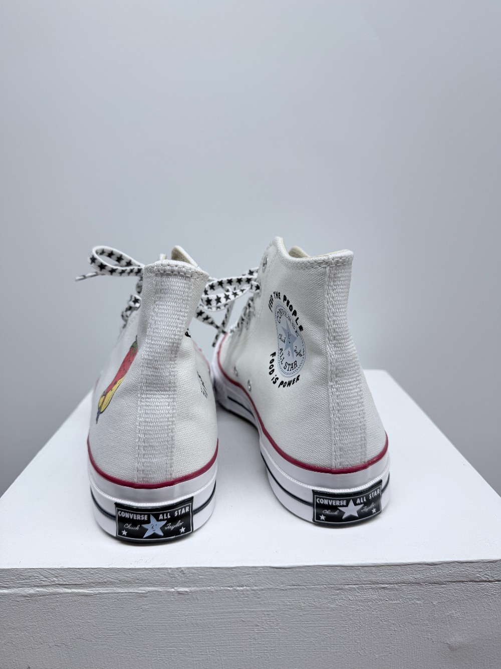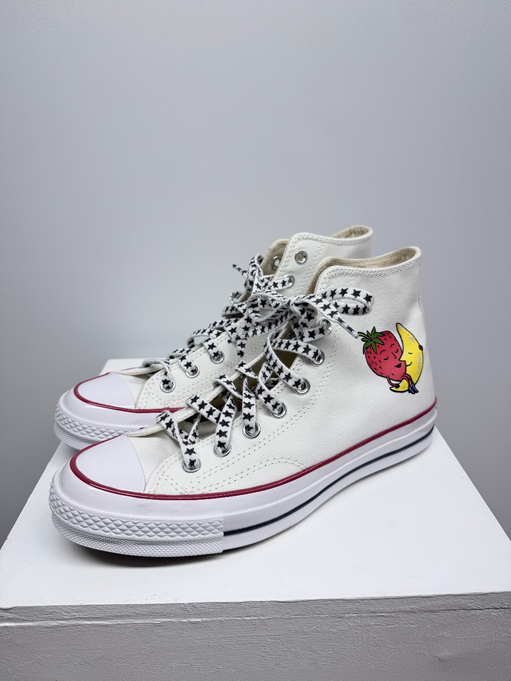Details: White strawberry and moon graphic high top sneakers.