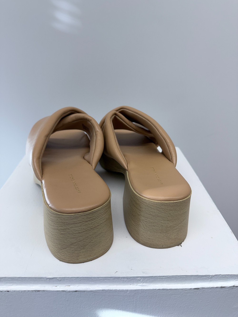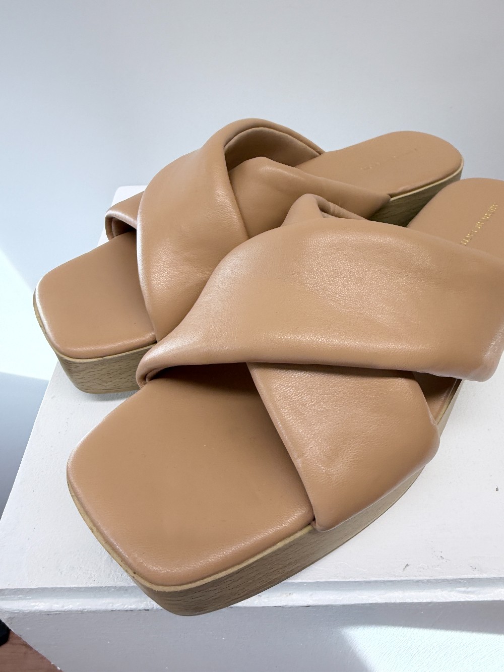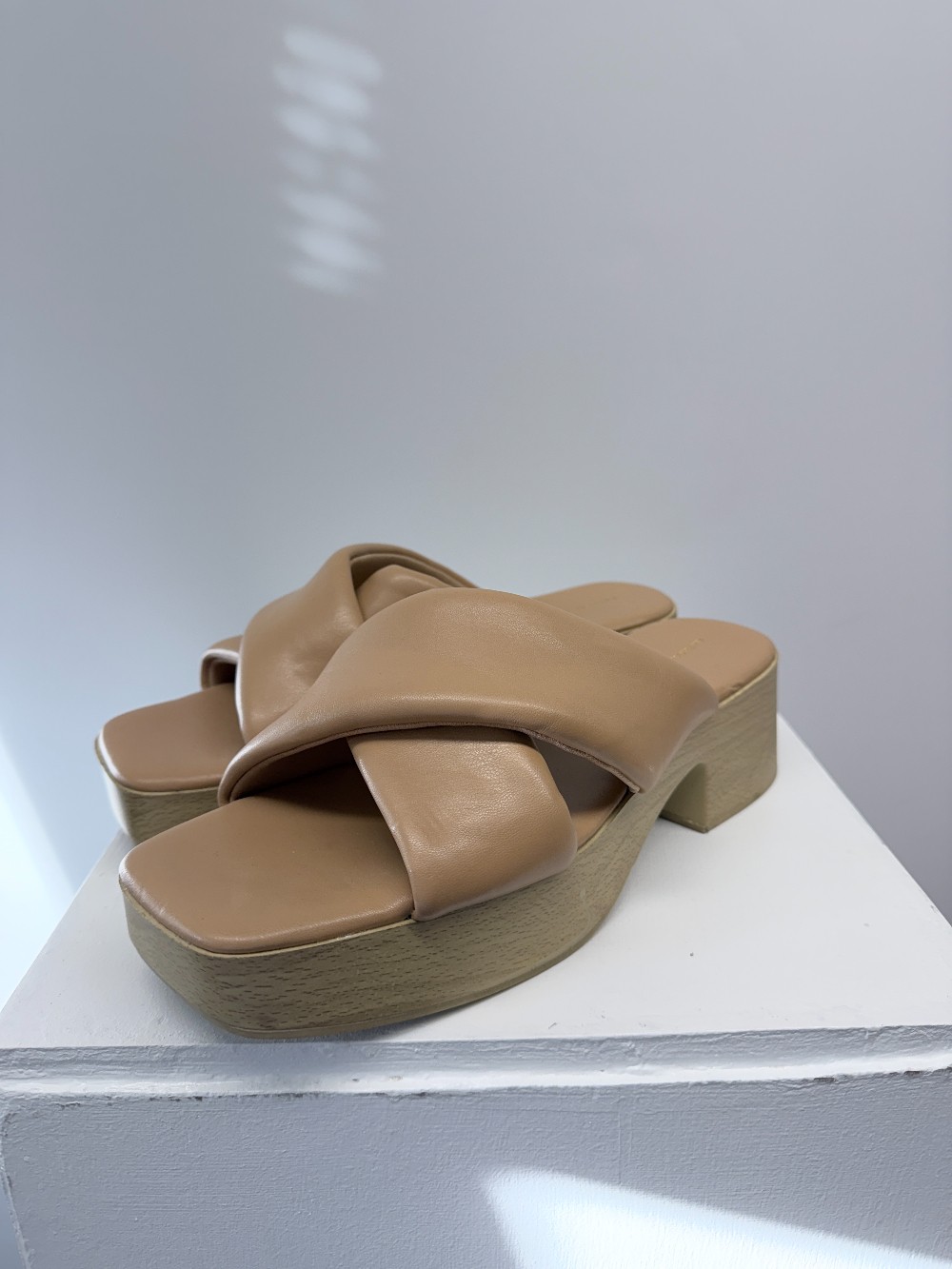 Details: Tan puffy strapped platform heeled sandals.