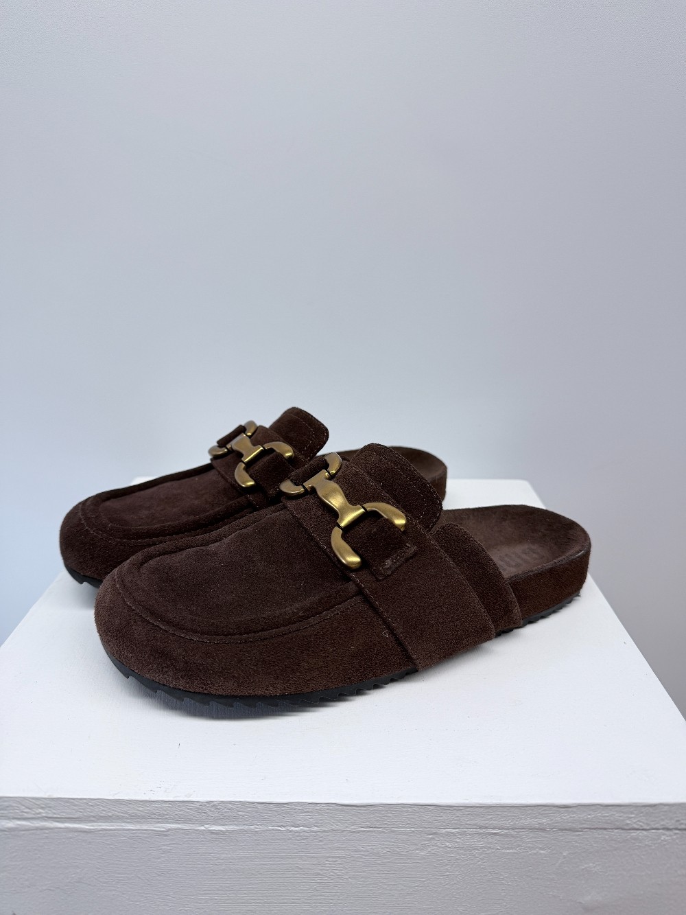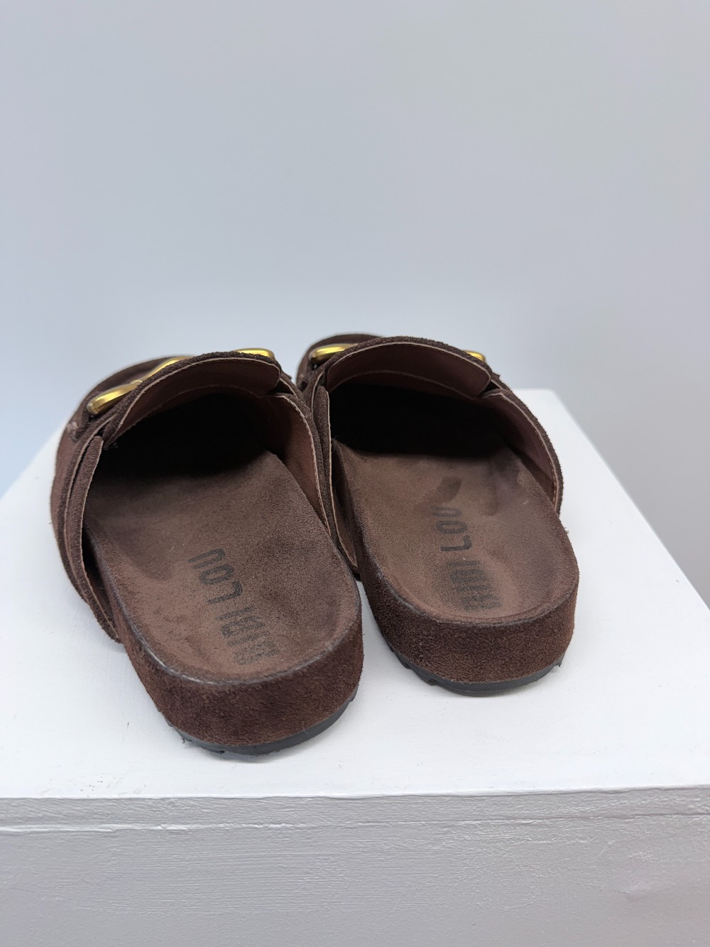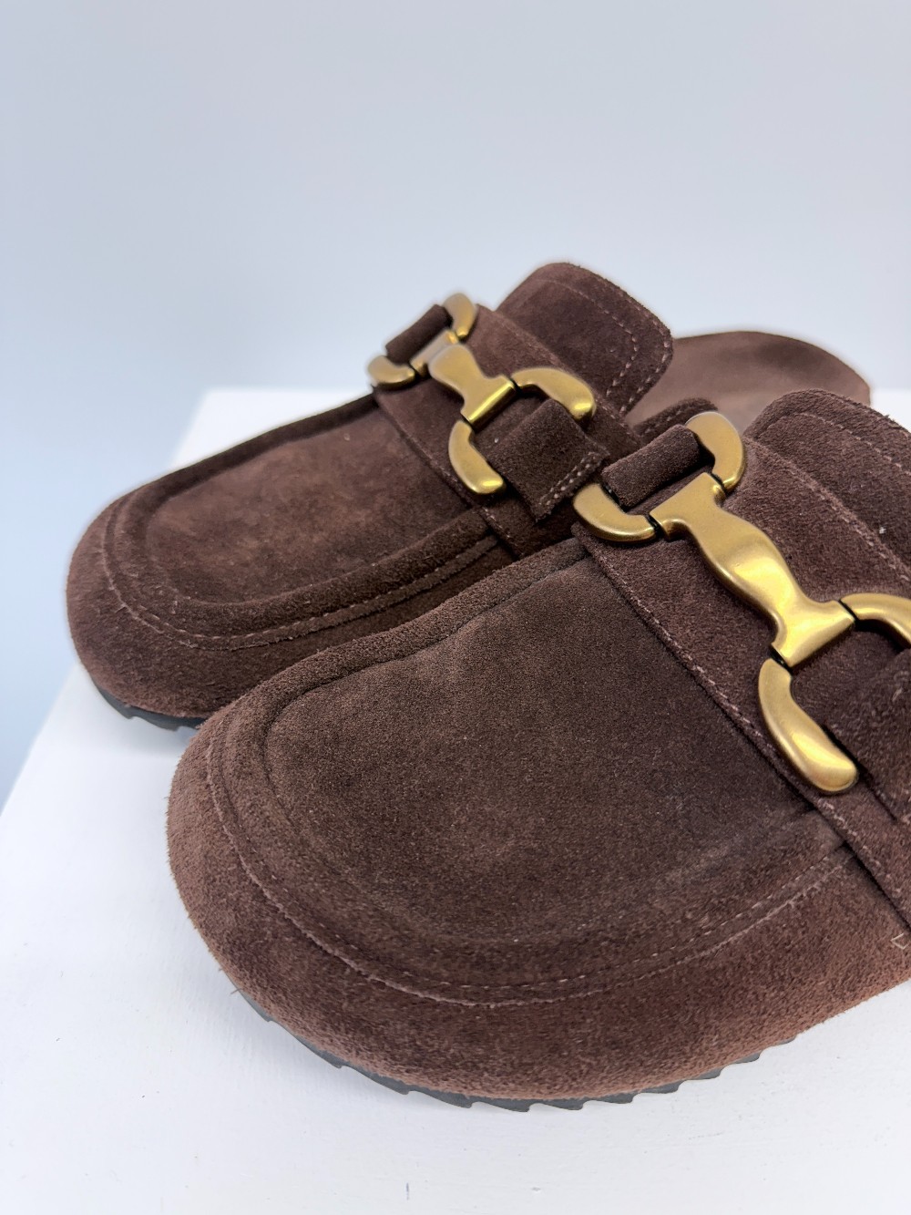 Details: Chocolate brown slides with gold hardware.