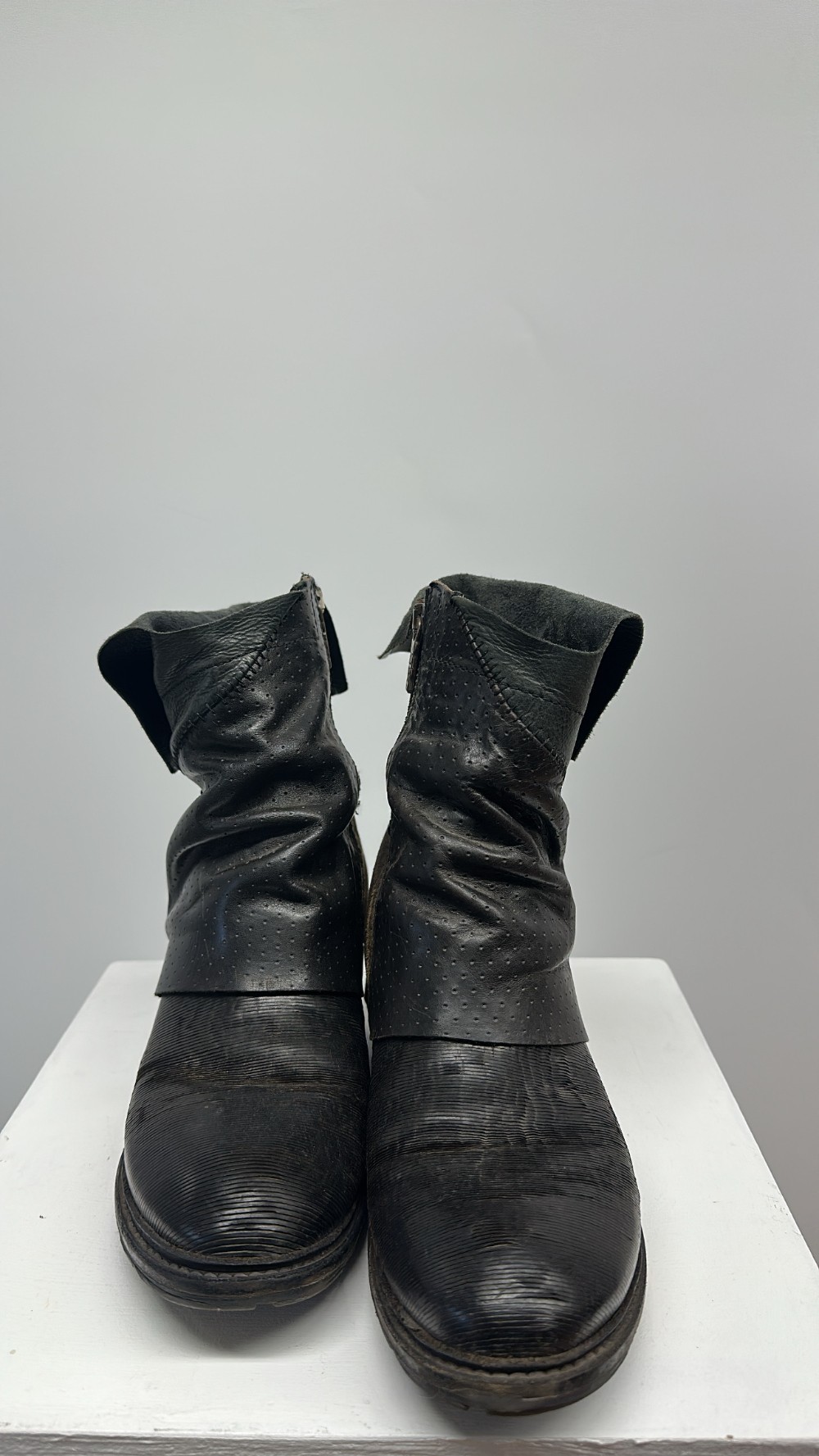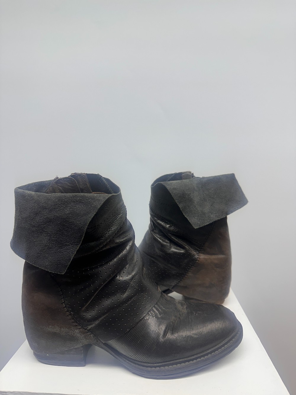 Details: Dark brown patchwork ankle boots.