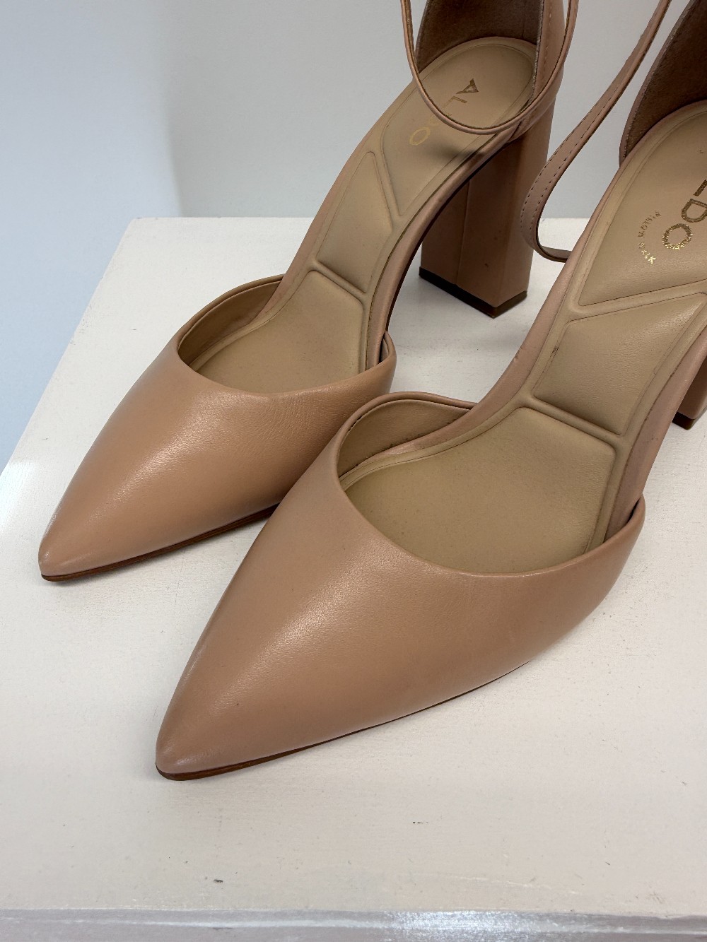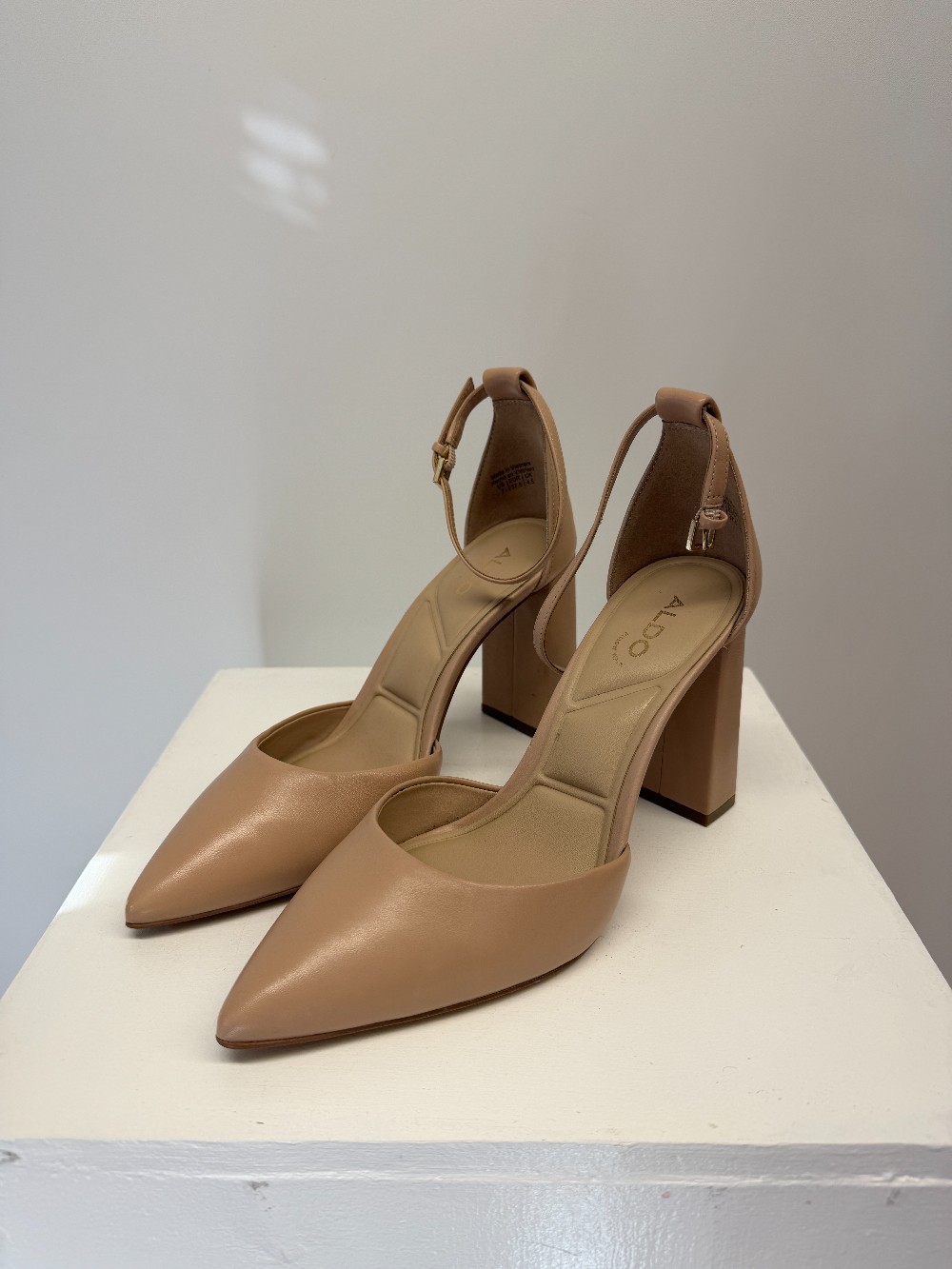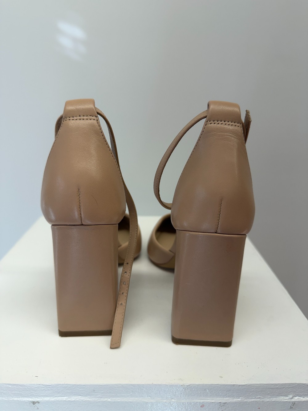 Details: Neautral beige tall heels with adjustable strap.