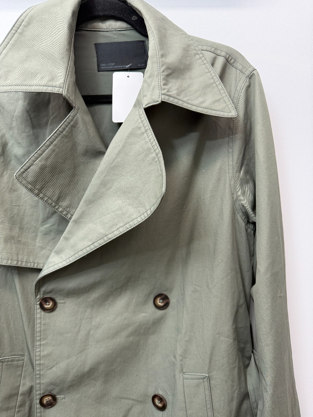 Details: Dull green trench coat with belt.