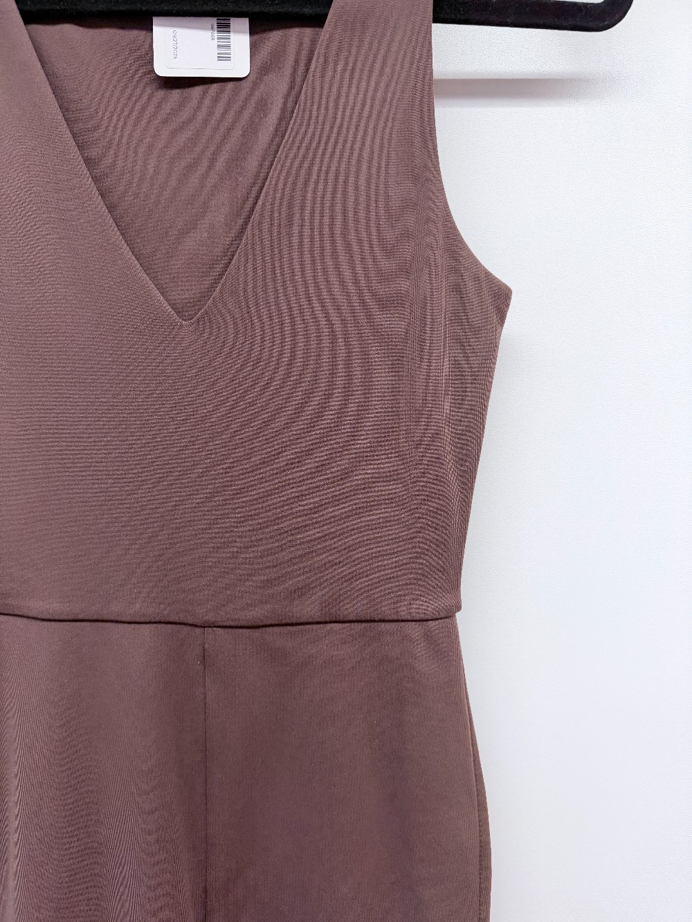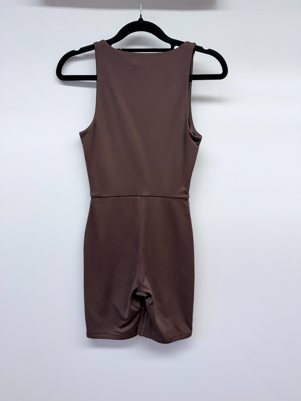 Details: Chocolate brown knee length v-neck jumpsuit.