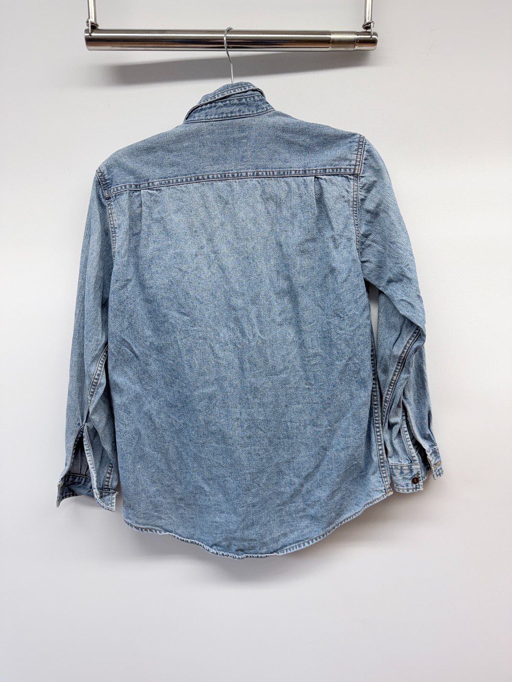 Details: Mid wash collared denim button up shirt.