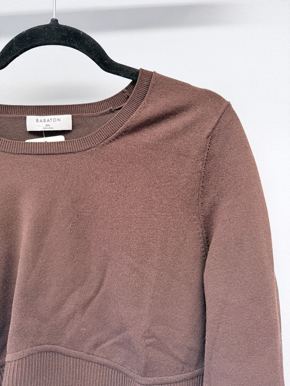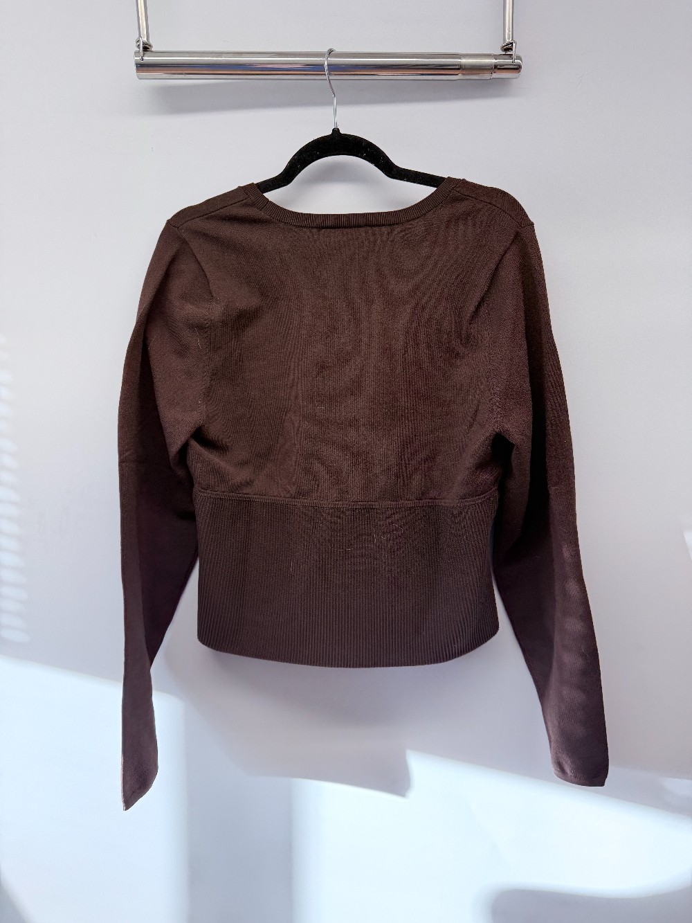 Details: Chocolate brown ribbed waist contour long sleeve top.