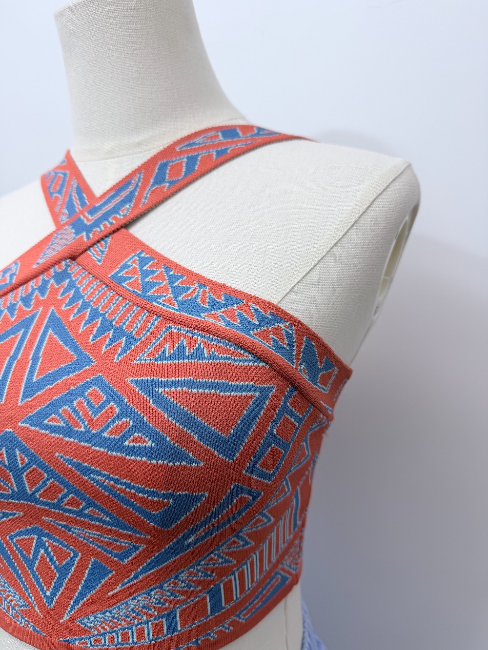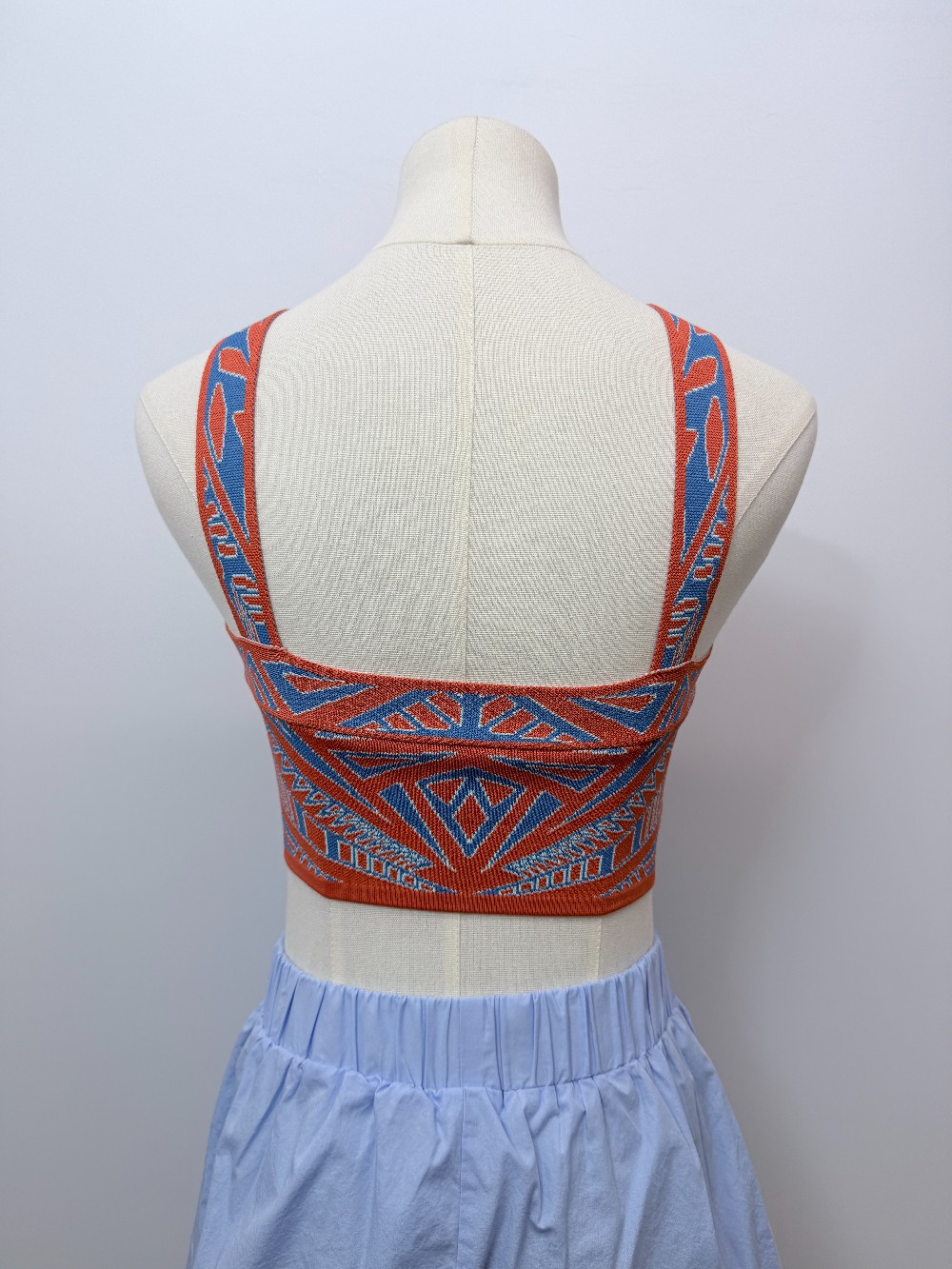 Details: Bright orange and blue patterned cropped criss cross strap top.