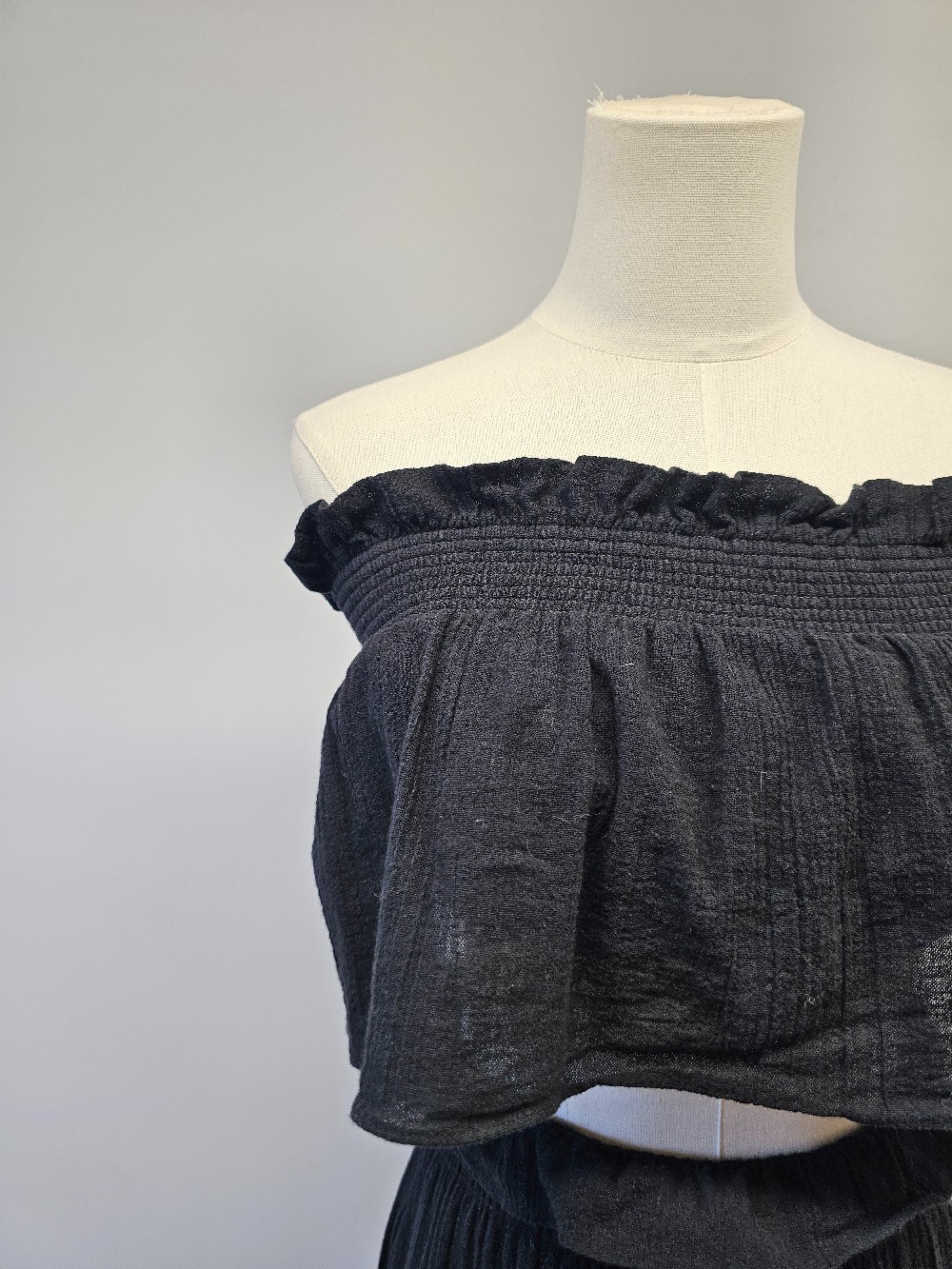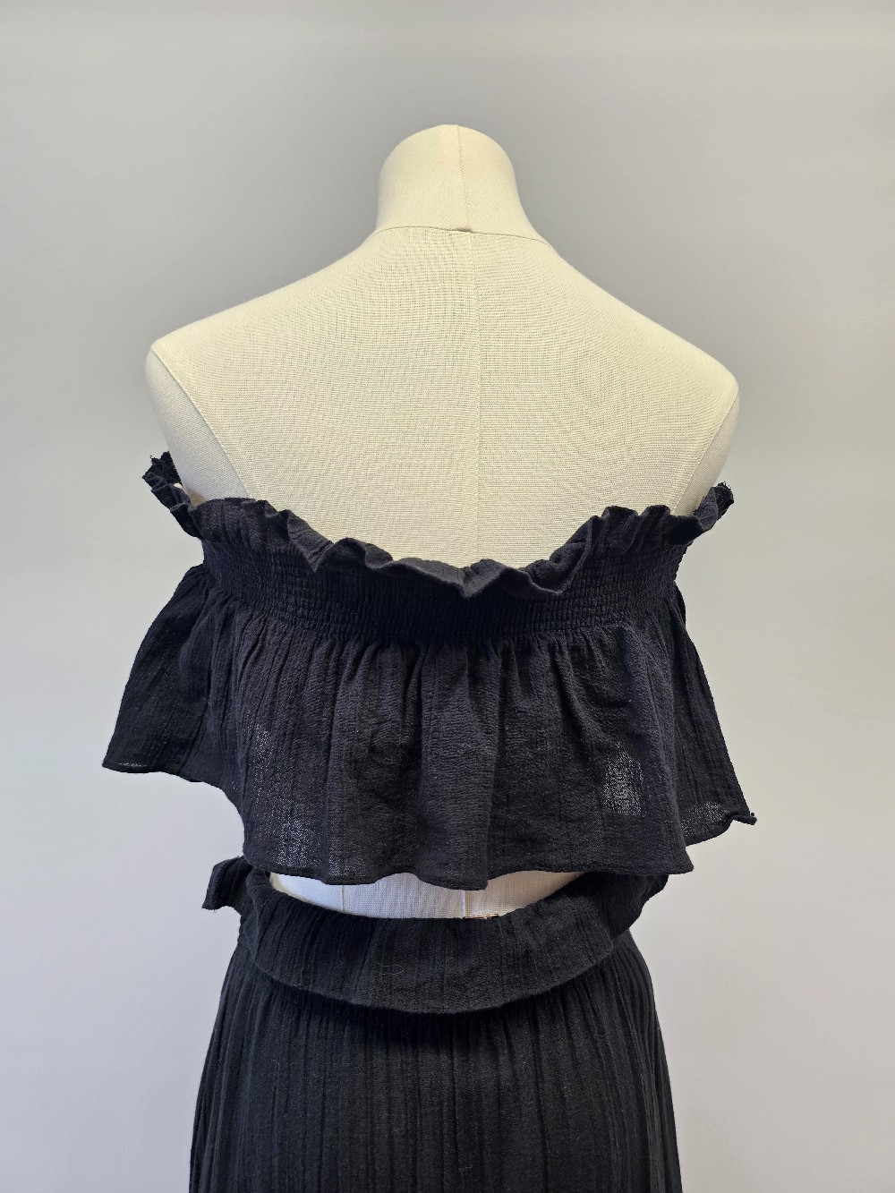 Details: Black ruffle bandeau top. Matching skirt sold separately.