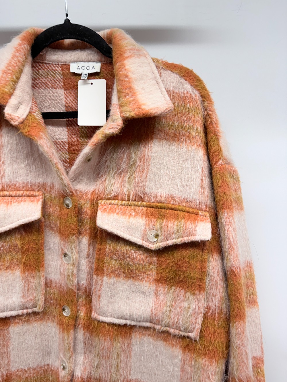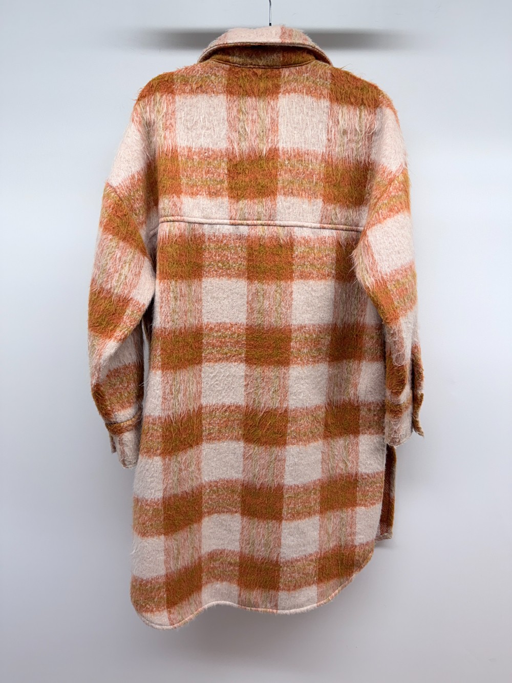 Details: Orange and peach fuzzy plaid long shacket.