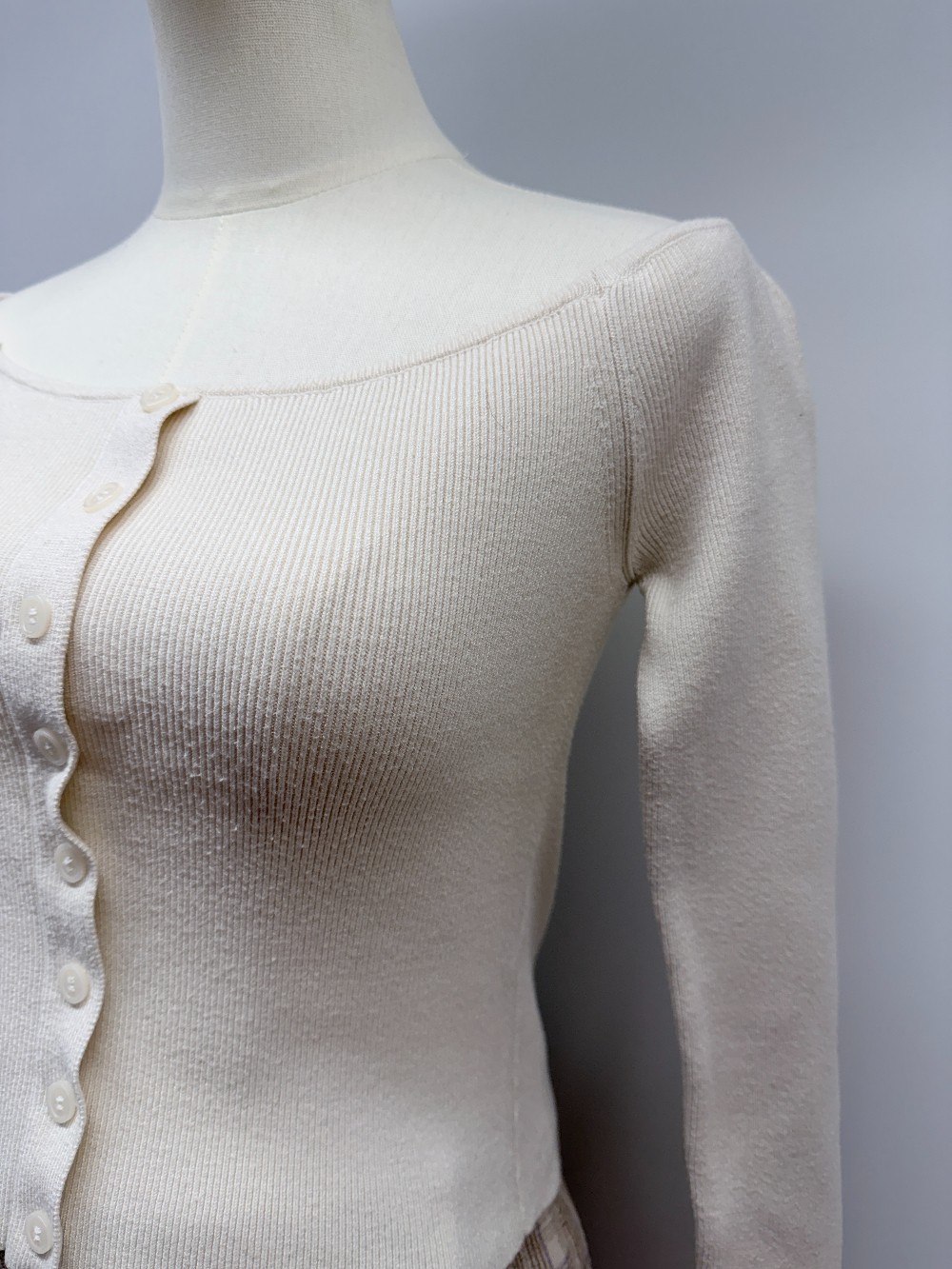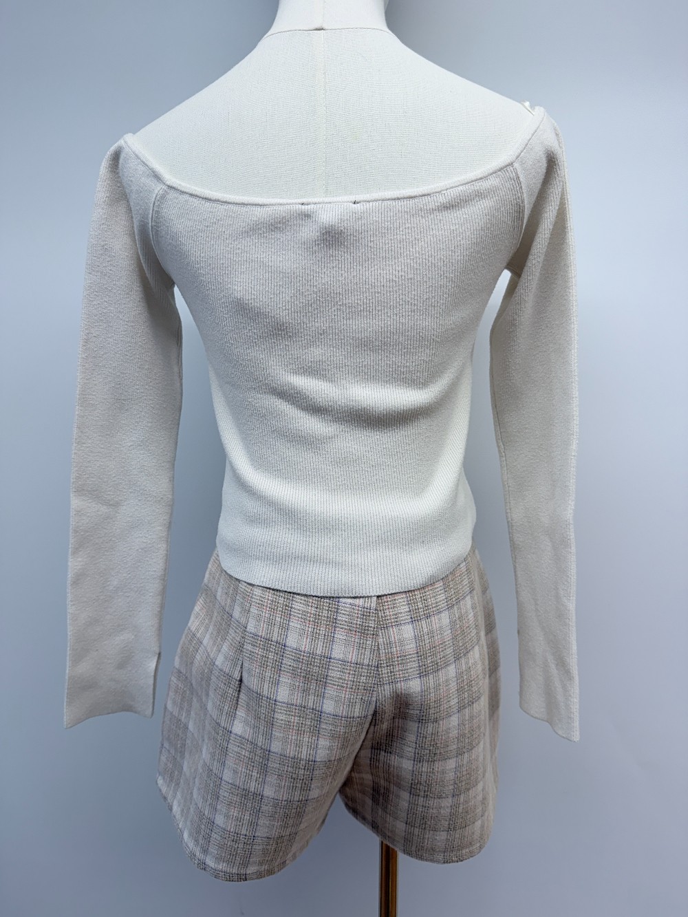 Details: Beige off shoulder long sleeve top with faux buttons.