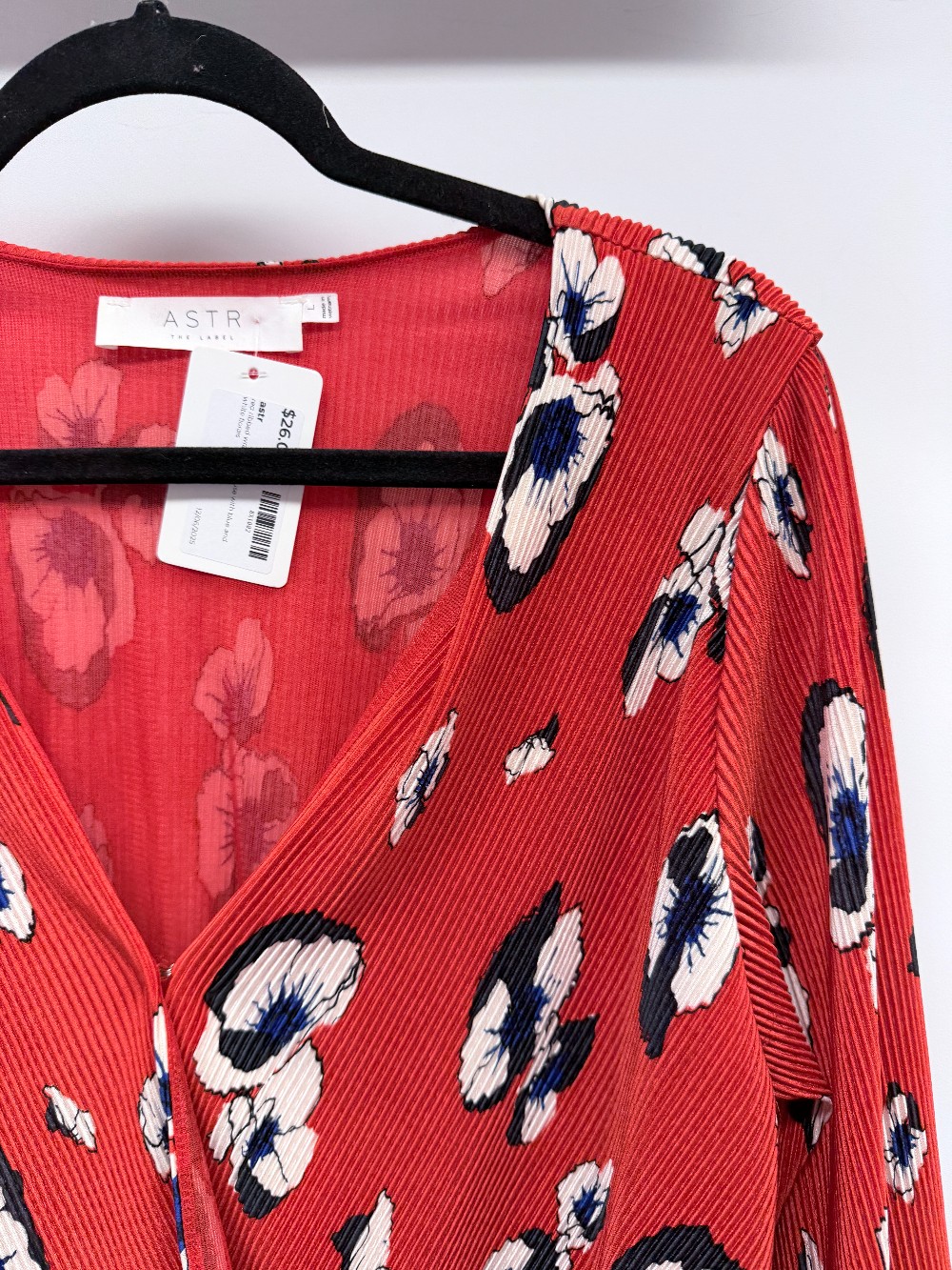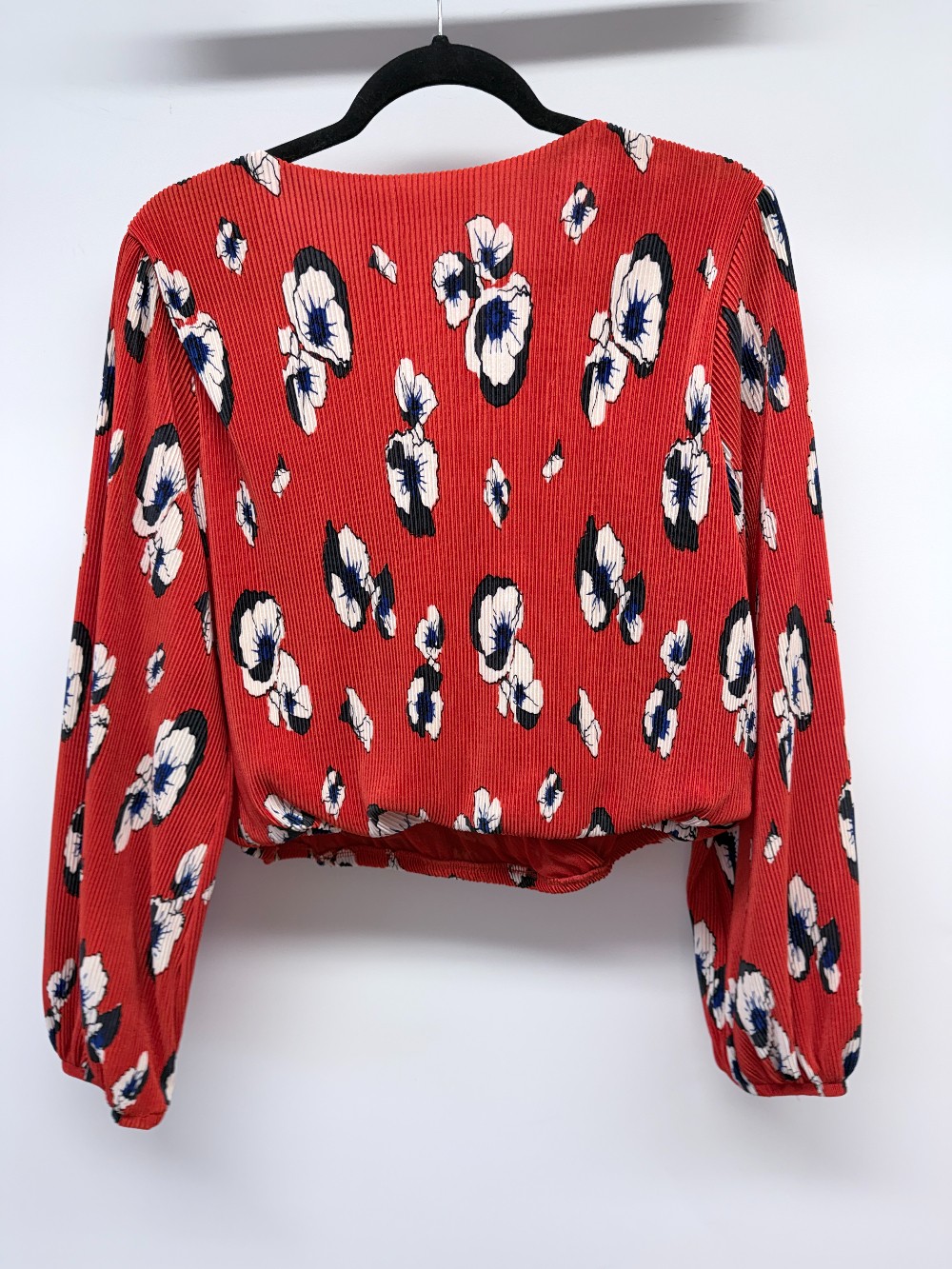 Details: Bright red ribbed deep V blouse with blue and white florals.