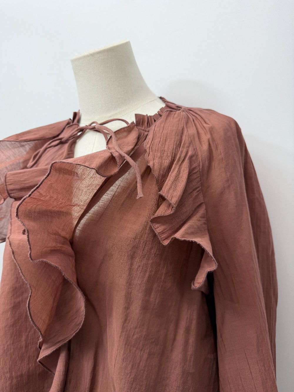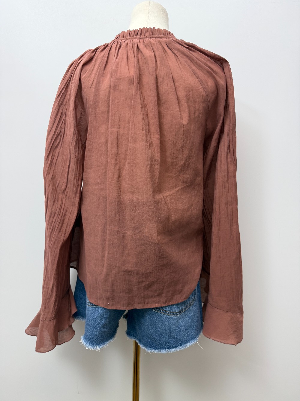 Details: Warm brown bell sleeve ruffle top.
