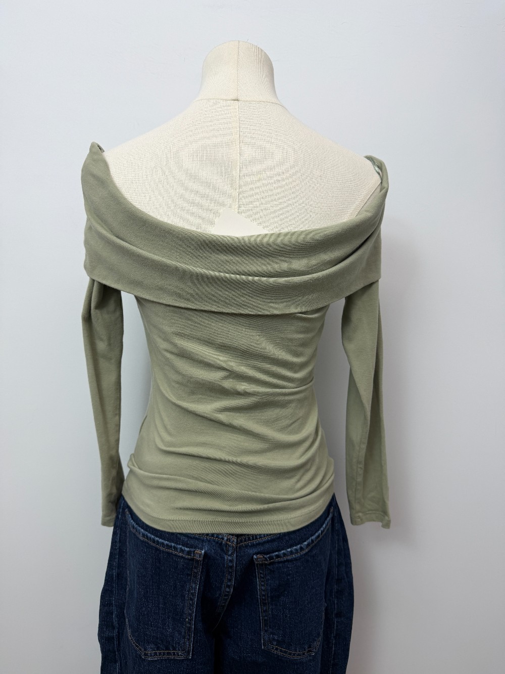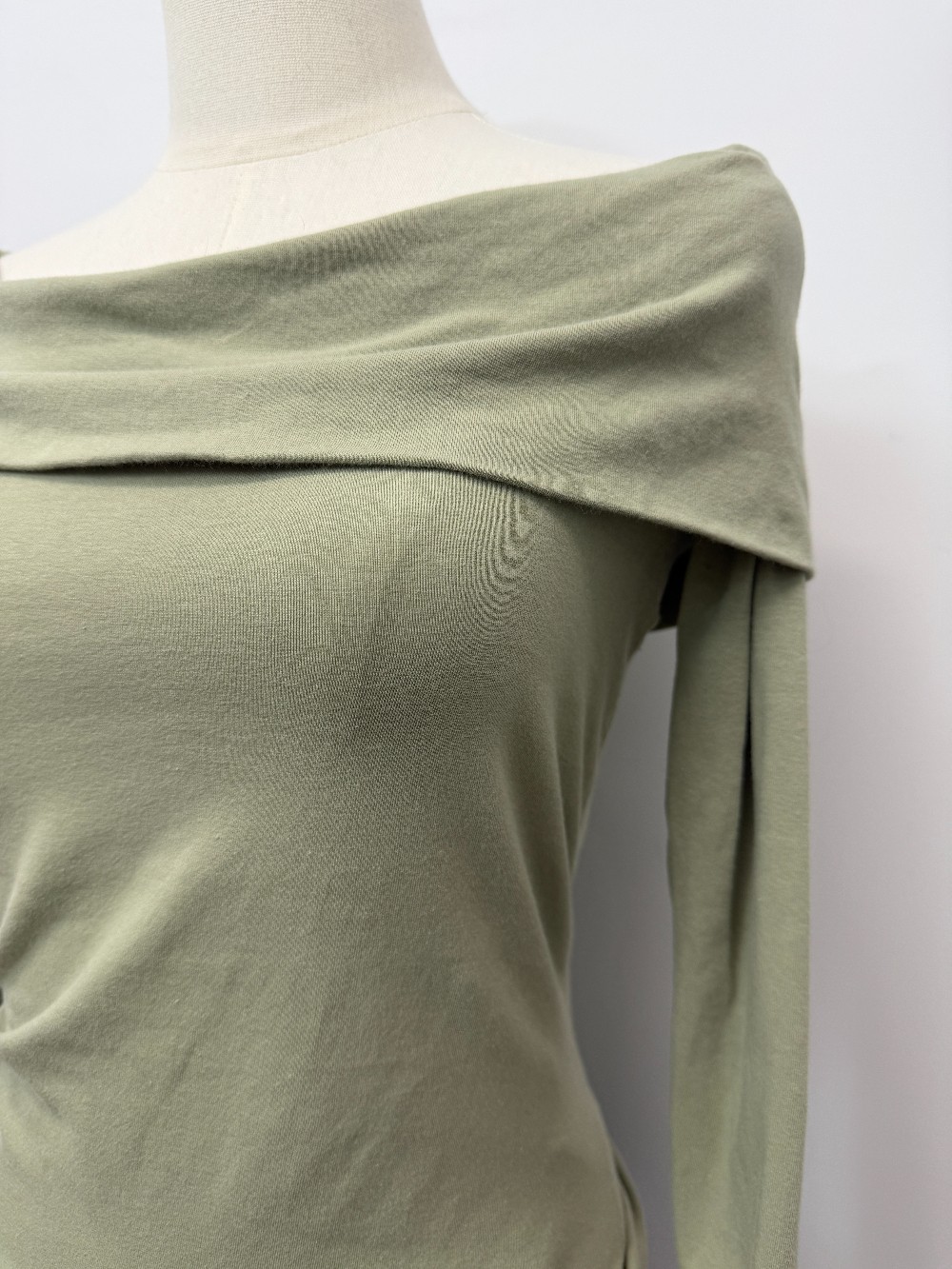 Details: Light sage green long sleeve off shoulder top.