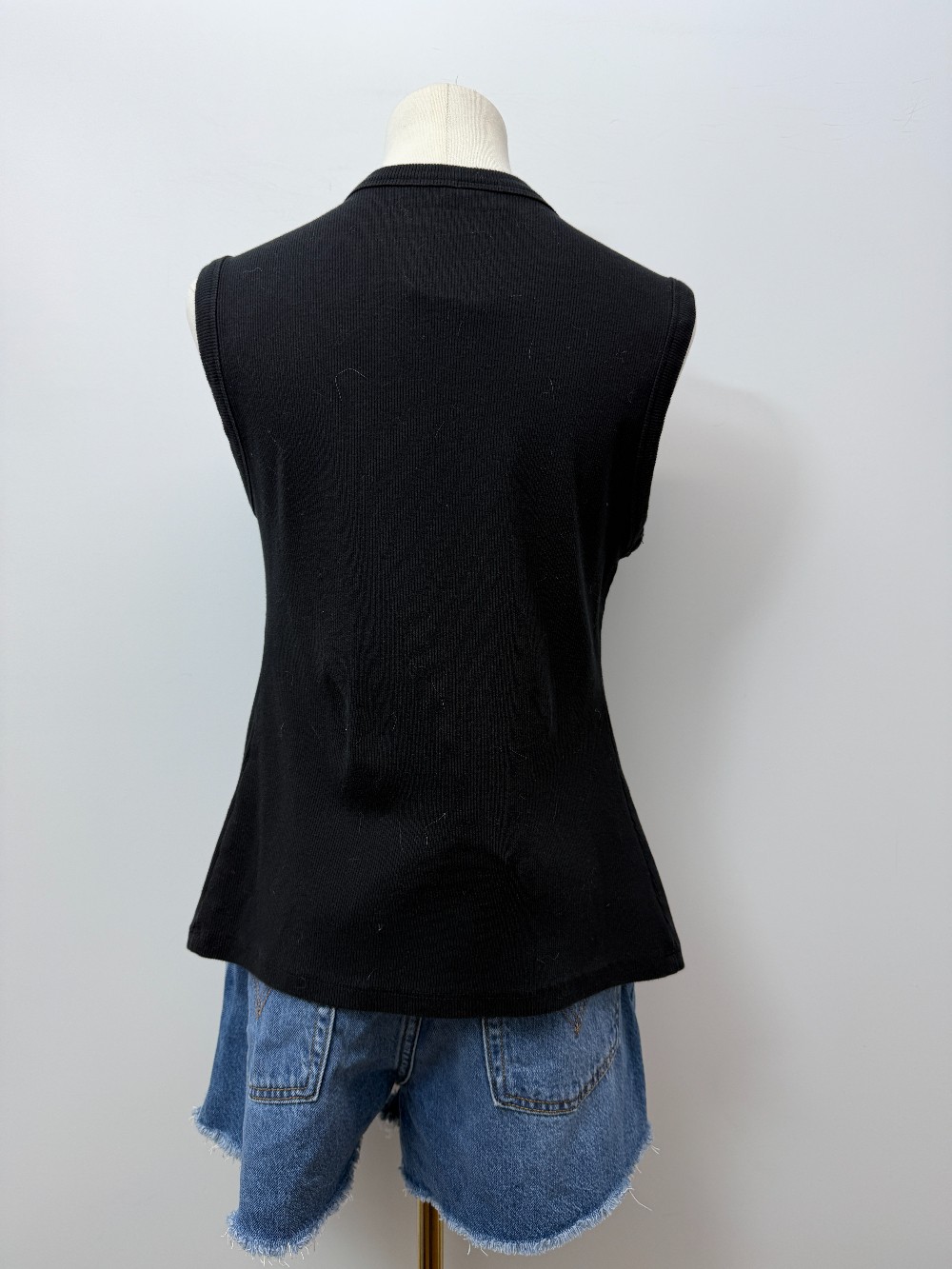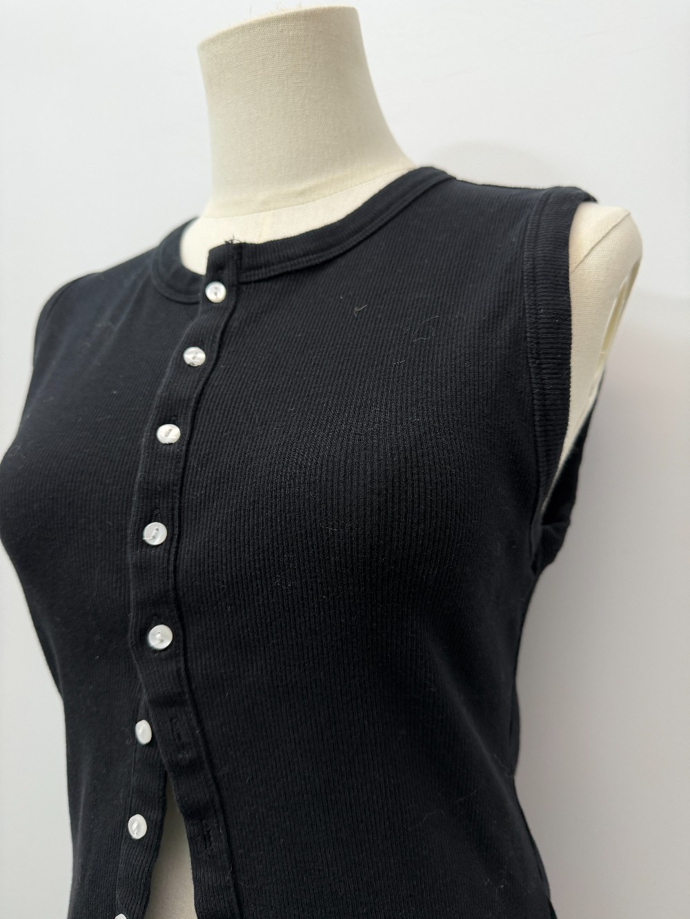 Details: Black buttoned ribbed tank.